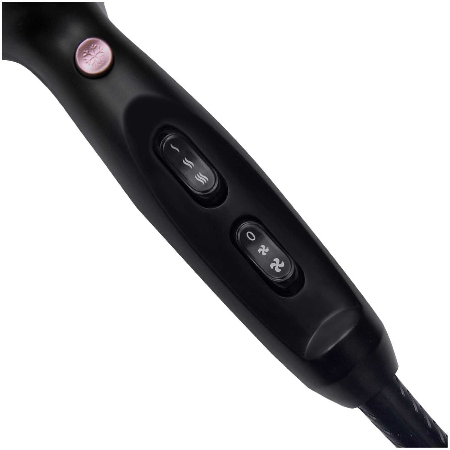 - Фен достаточно компактный. Его очень удобно хранить и брать с собой в путешествия. Быстро сушит волосы, не принося им вред. Есть холодный воздух.