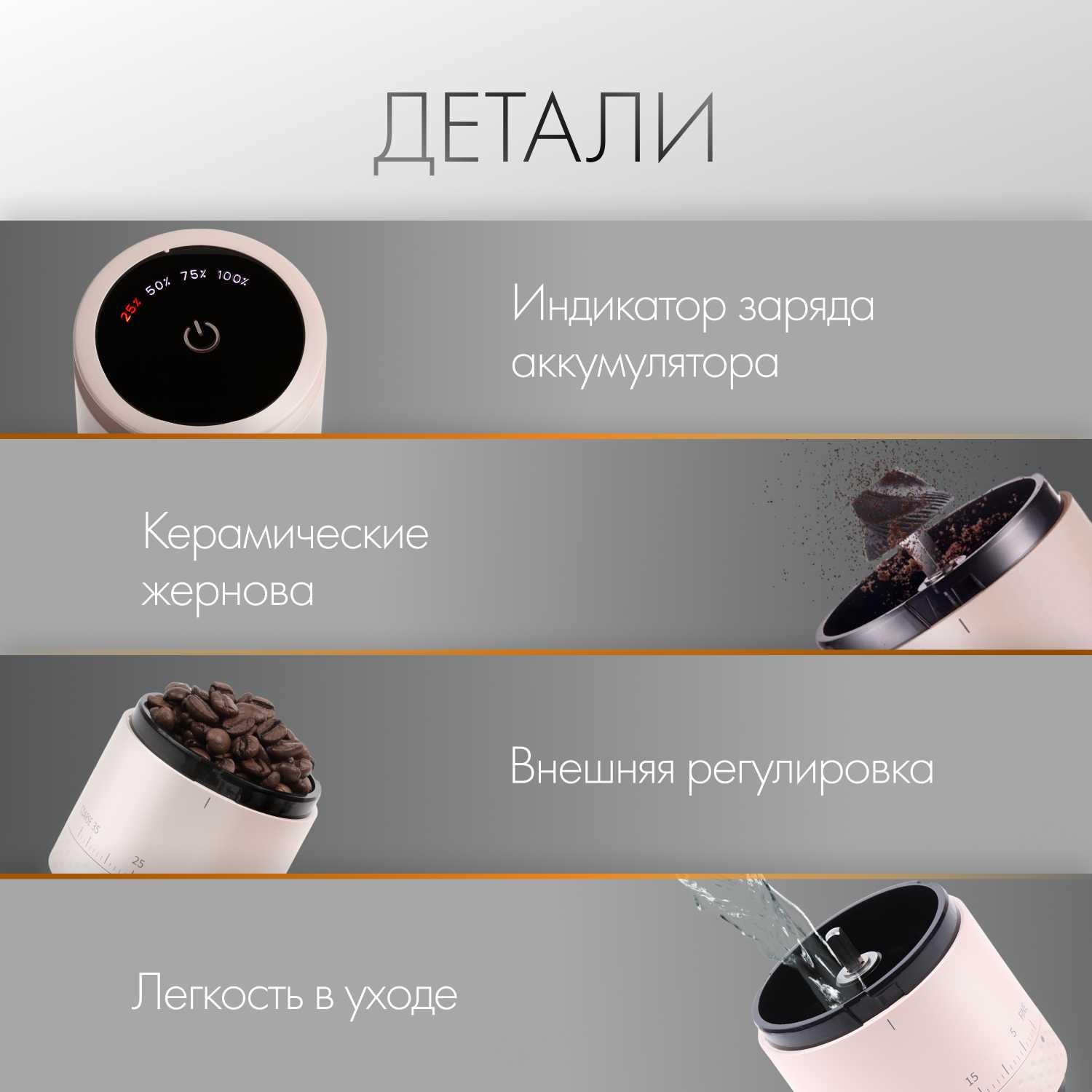 - + регулирование степени помола, работа от аккумулятора