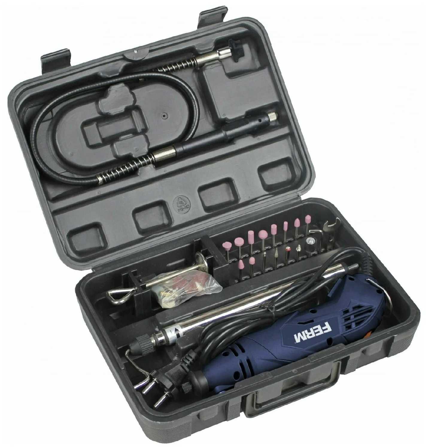 Добротный фрезер по нормальной цене с комплектом насадок, гибким валом и подвесом для крепления, упакованный в компактный удобный кейс.