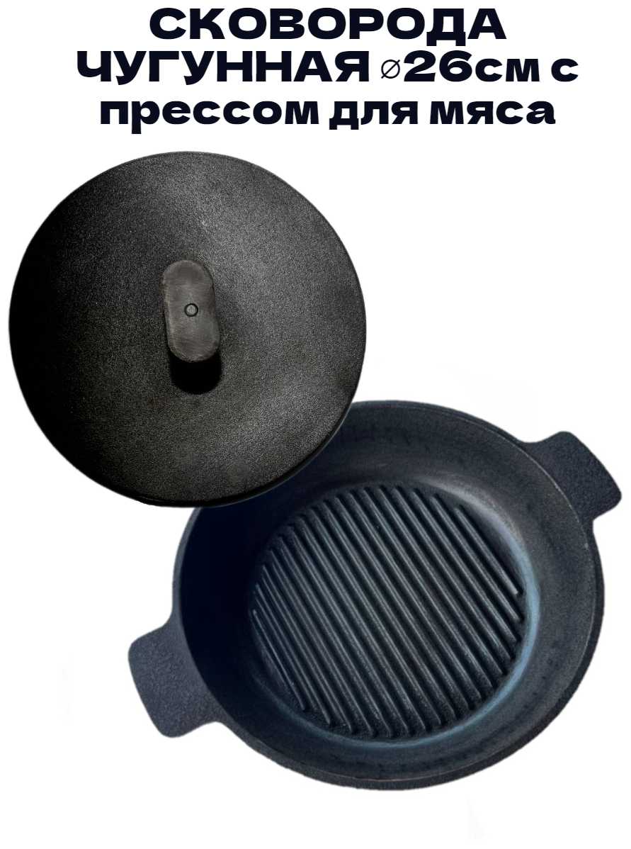 - комплектация: Сковорода-гриль чугунная d260мм - 1 шт.; Пресс для мяса d24 см 1 шт.