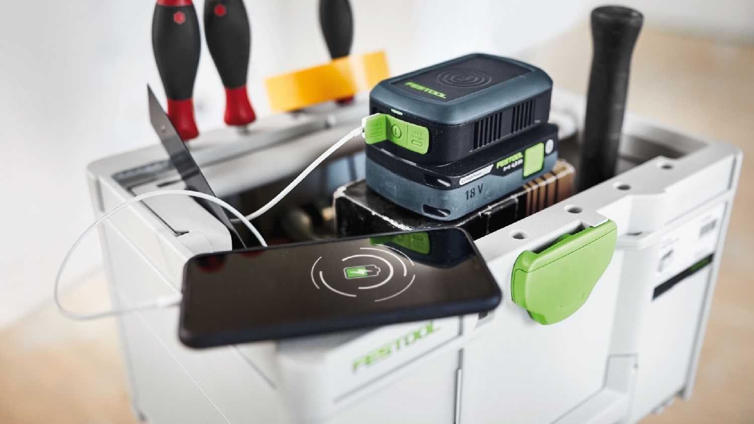 Удобная приспособа, которая превращает аккумулятор Festool на 18v в пауэрбанк, радует наличие беспроводной зарядки, порт USB и type-C, удобно когда работаешь и под рукой нет источника энергии!