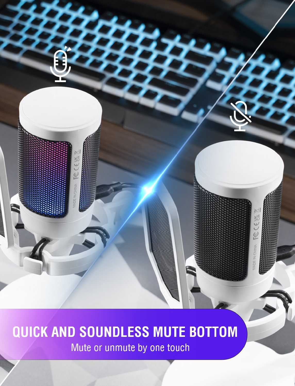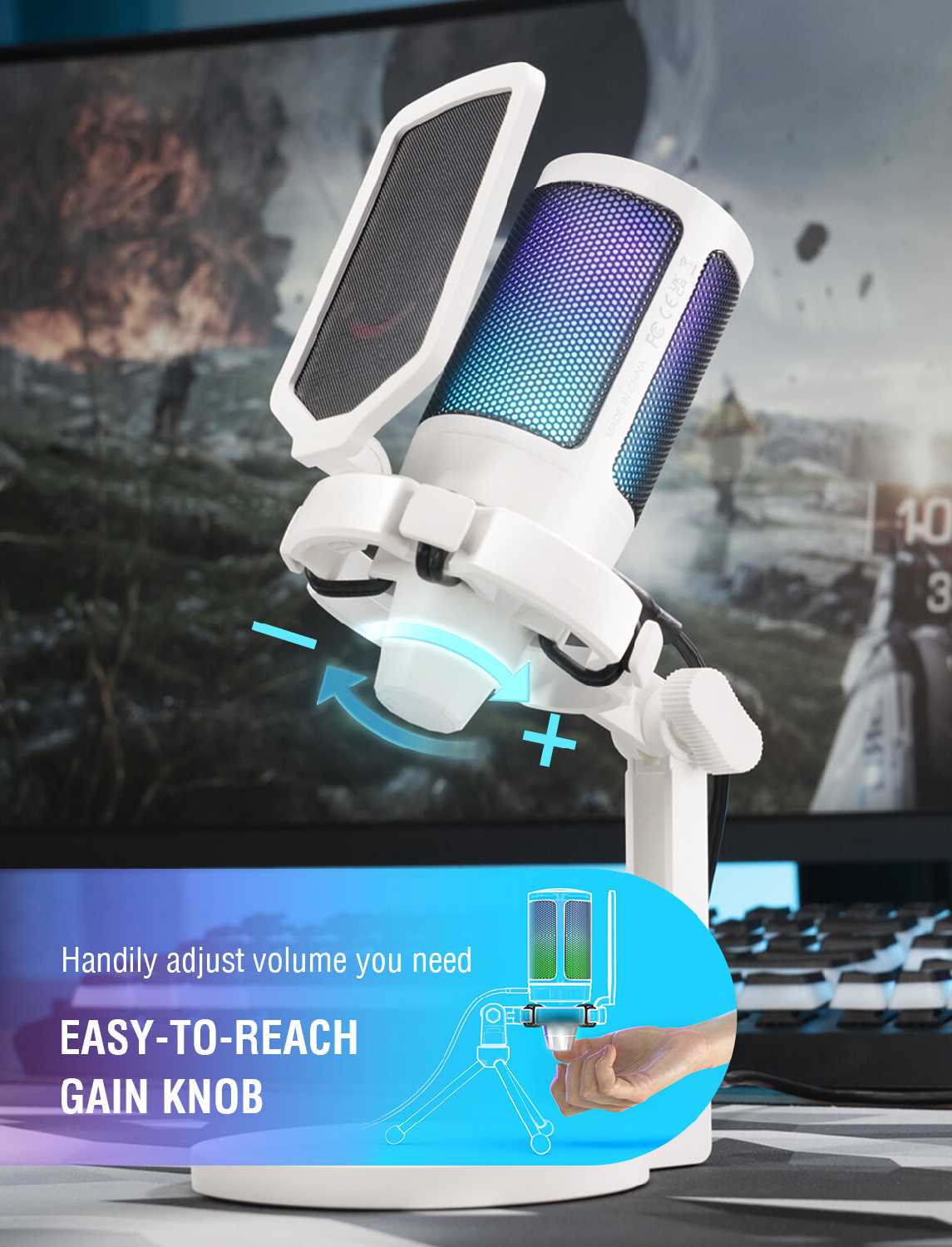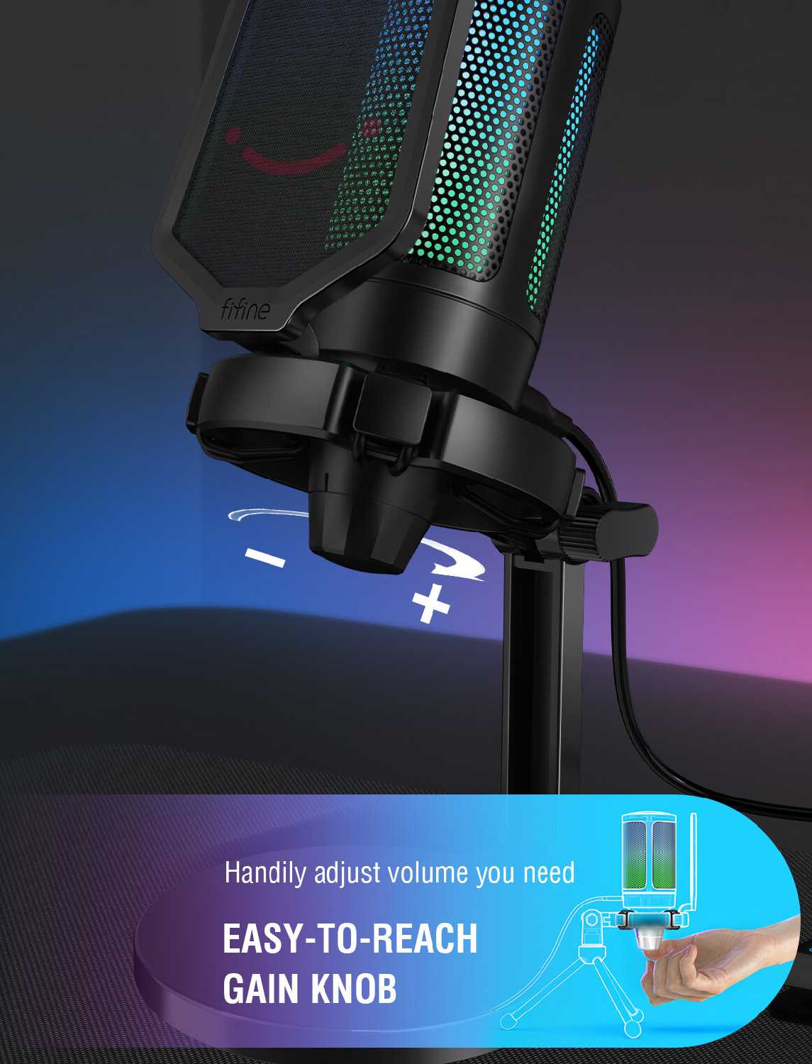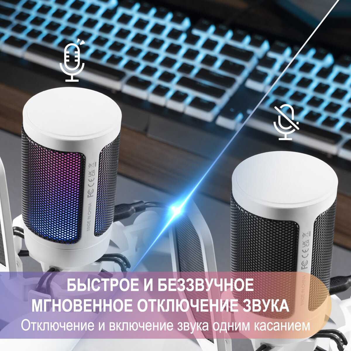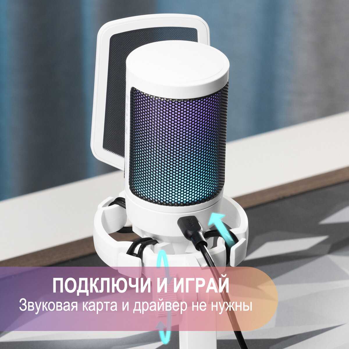 У микрофона снизу регулируется громкость, а сверху сенсорная кнопка отключения микрофона. Провод идеальной длины: не короткий и не длинный. Ножка круглишком идеально занимает места на столе не больше, чем размер самого микрофона.
