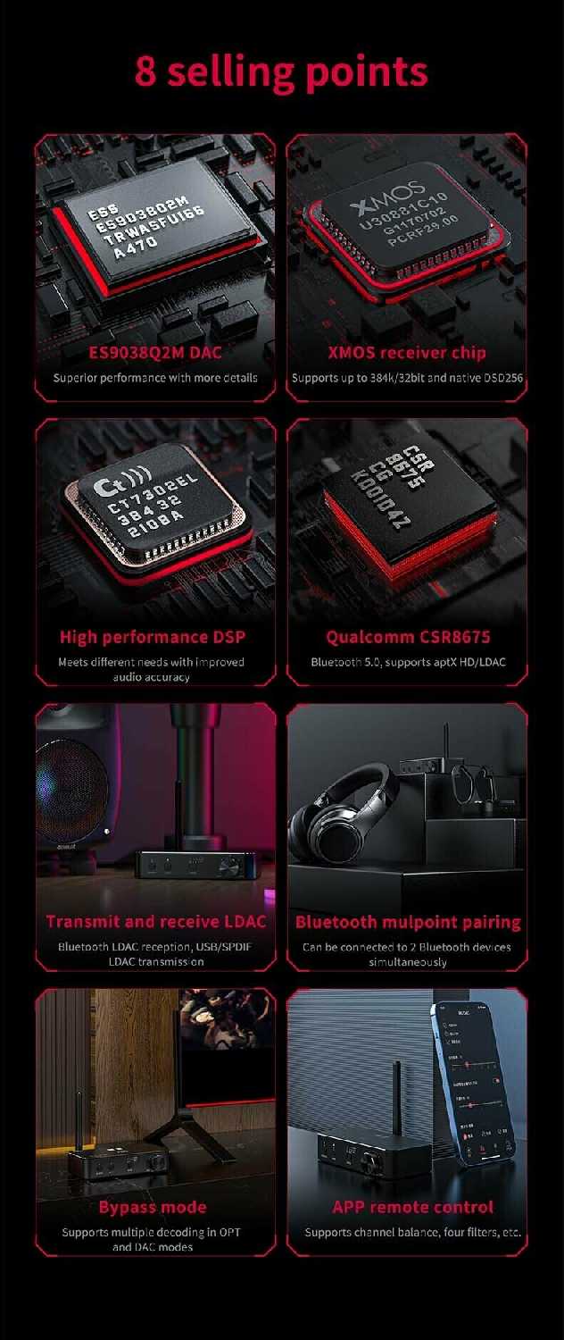 - + Компактное аудио-устройство, которое питается от разных источников и при этом удобно по размерам. Подключается по USB к компьютеру, планшету и телефону; также поддерживает Bluetooth, так что можно использовать беспроводные источники. Имеются оптический вход и оптический выход — можно одновременно подключить внешний ЦАП и усилитель. Хорошие Bluetooth-кодеки и достойное качество звука и сборки; всё работает стабильно и без нареканий.