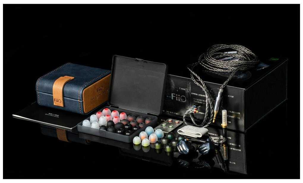Сменный балансный аудио разъем 4.4мм, щётка для чистки, 2 дополнительные пары звуководов (красный - басс, зелёный - высокие частоты, и уже установленный белый - баланс), чехол, магнитный ремешок, скрепка для извлечения звуководов, руководство пользователя.