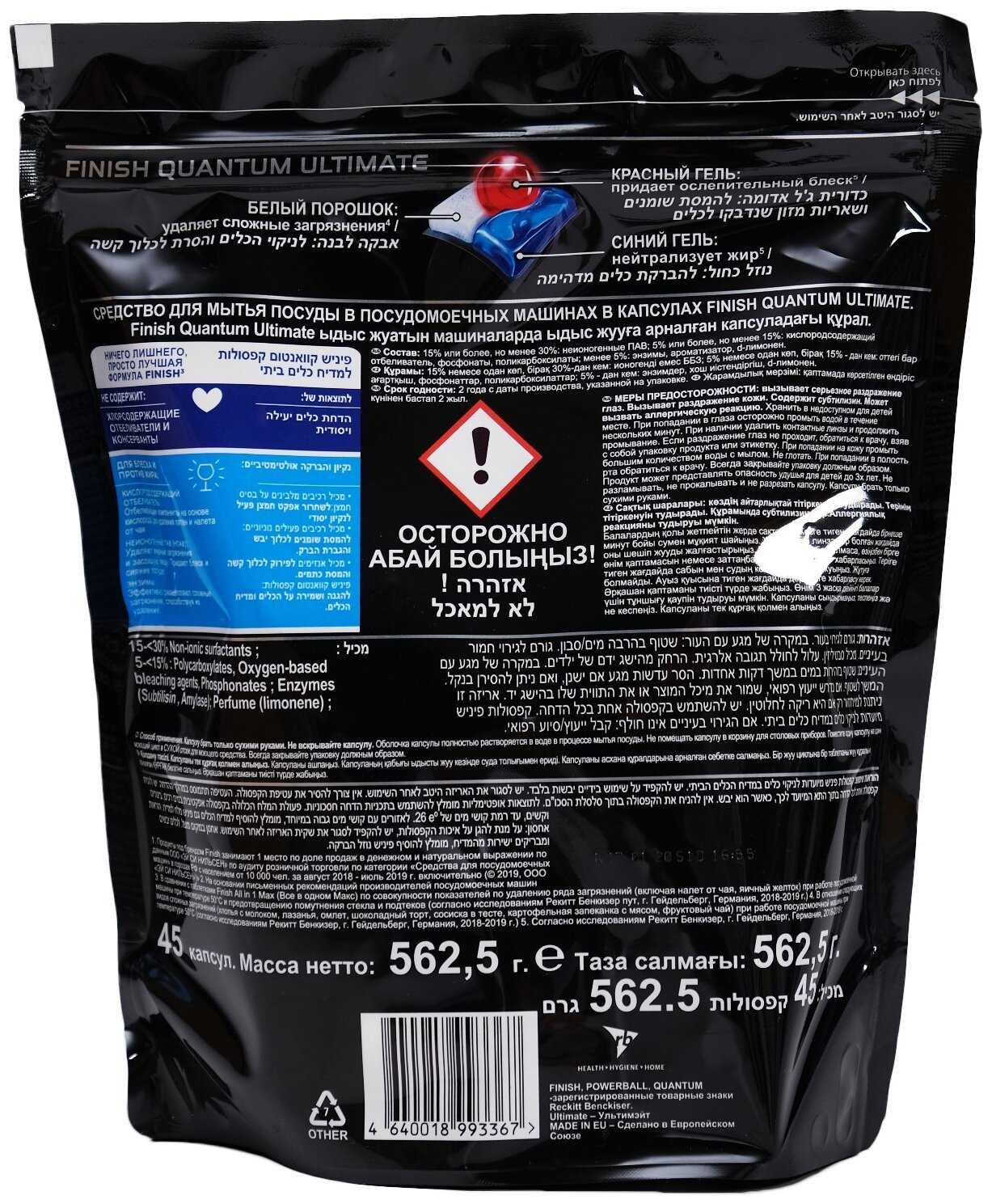- + Капсулы Finish Quantum Ultimate удобны и просты в использовании, вам не нужно отмерять моющее средство или беспокоиться о разливах.