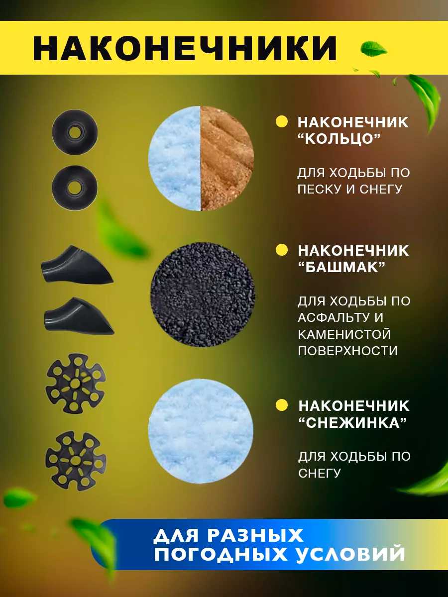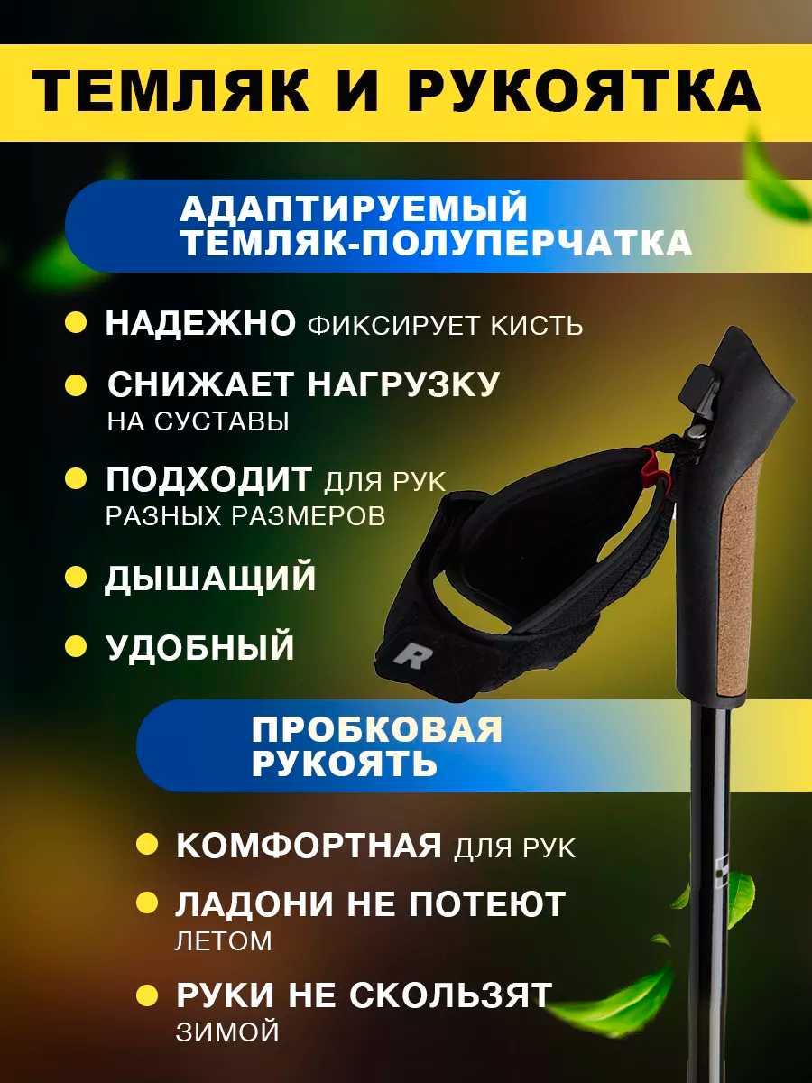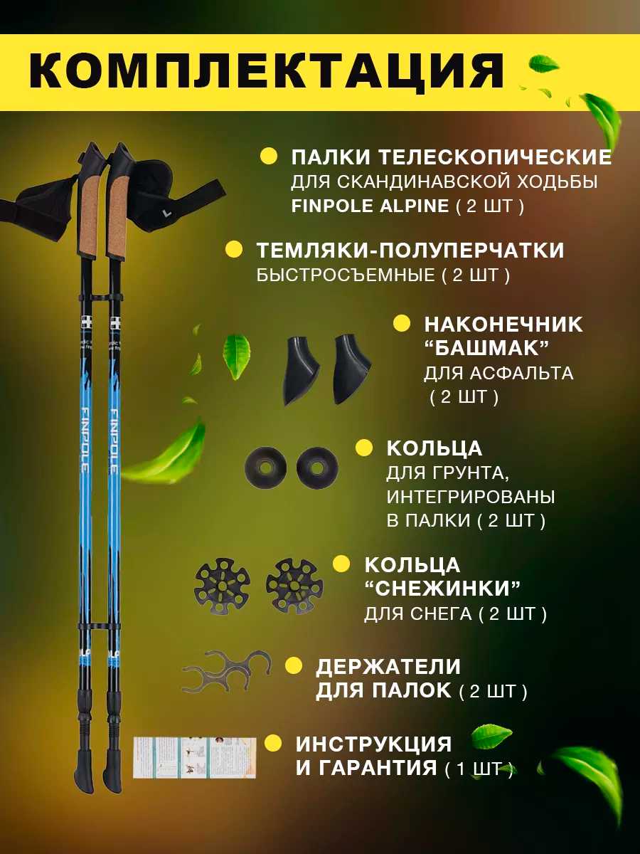 Дополнительная информация : | Темляк: быстросъемный темляк-полуперчатка (Flexi C+), использование: снег асфальт пересеченная местность, комплектация: Палки для скандинавской ходьбы - 2 шт. Быстросъемный темляк-полуперчатка - 2 шт. Съемный резиновый наконечник для асфальта - 2 шт. Несъемный металлический наконечник - 2 шт. Кольцо для песчаного грунта - 2 шт. Кольцо для снега - 2 шт. Инструкция по ходьбе и гарантия - 1 шт., сезонность: лето зима, диаметр кольца: 35 мм |