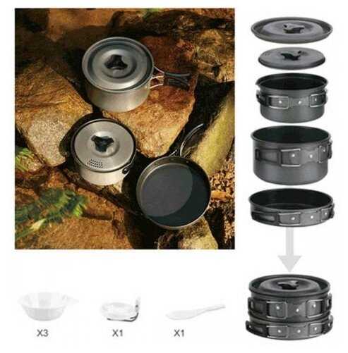 | Дополнительная информация : | складывается по принципу матрешки крышка от большого котелка подходит для сковороды, подробная комплектация: два котелка с крышками миска-сковородка три пластиковые миски суповая ложка складной половник |