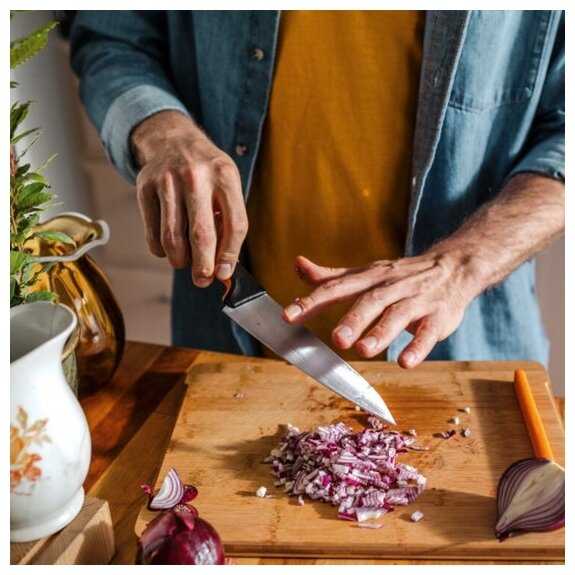 - + удобный, хорошо держит заточку, можно мыть в посудомойке.