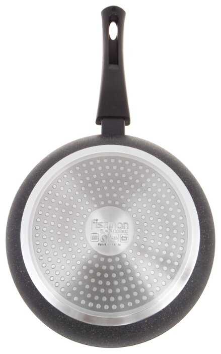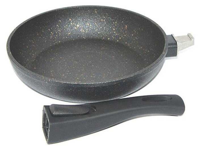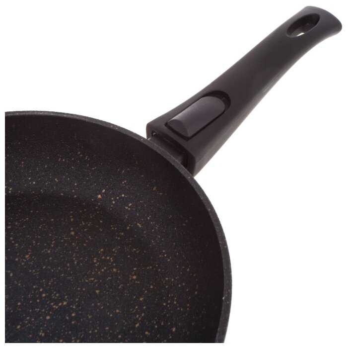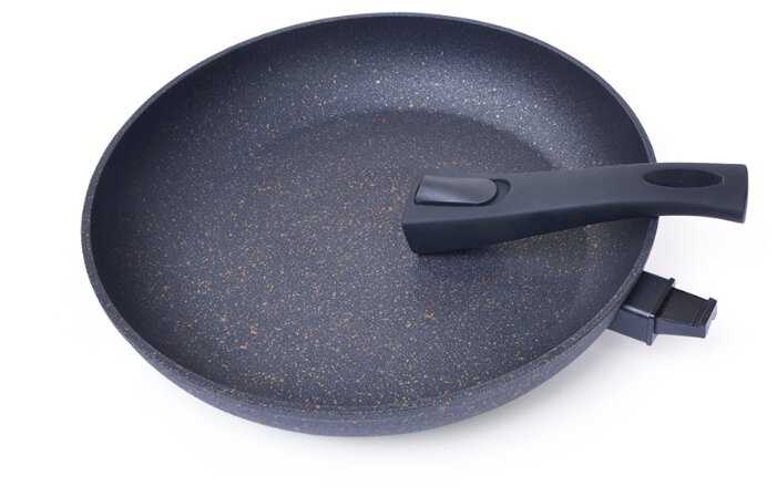 - + Пока судить о надёжности рано. Сковорода нетяжёлая. Поверхность шершавая. Съёмная ручка с покрытием софт-тач очень приятная на ощупь, в использовании удобная.