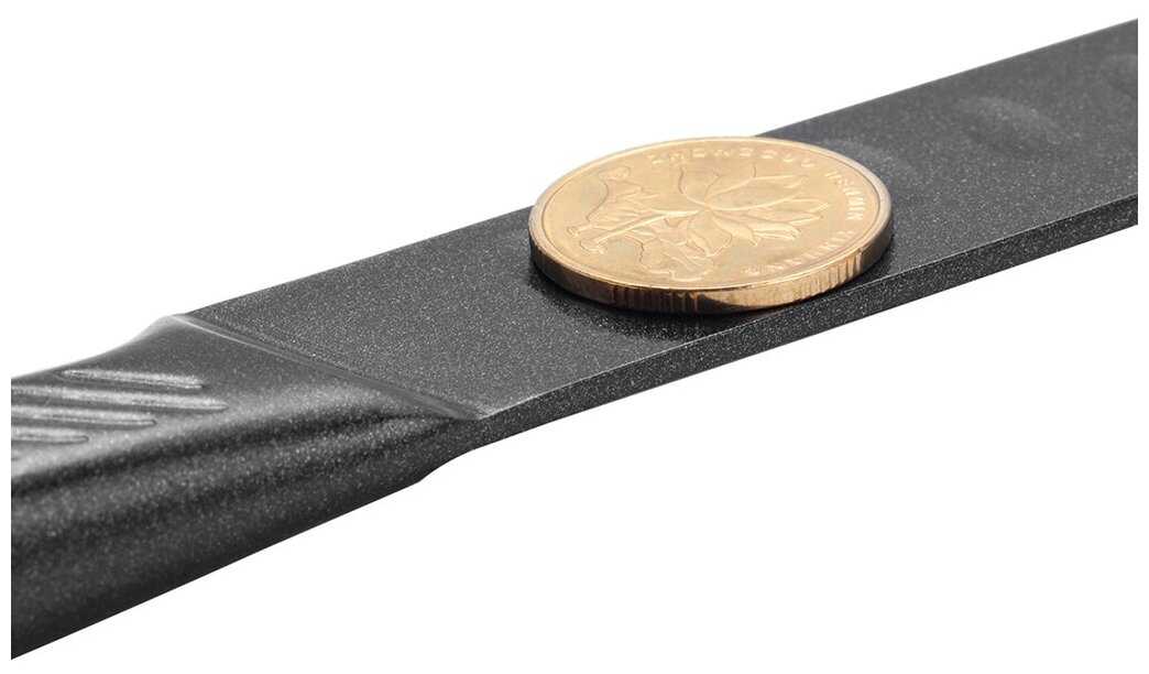 - + Тонкий, но жёсткий, неприлипающее покрытие острый, удобный в руке , металлическая ручка, лёгкий