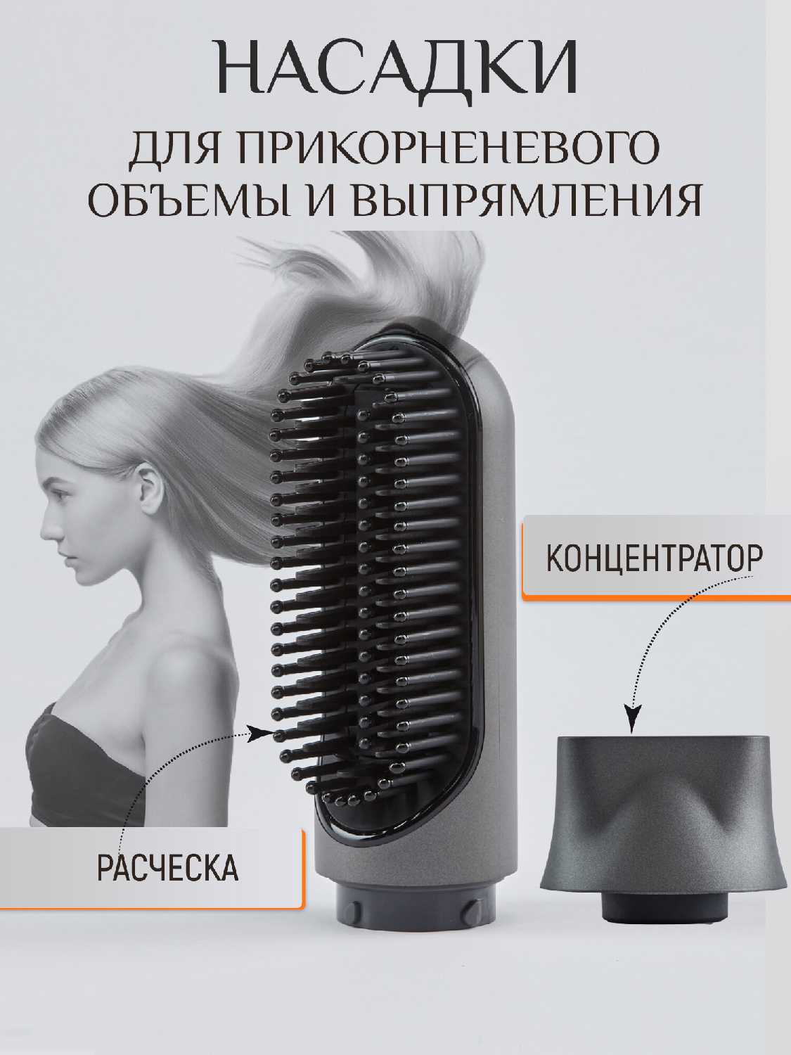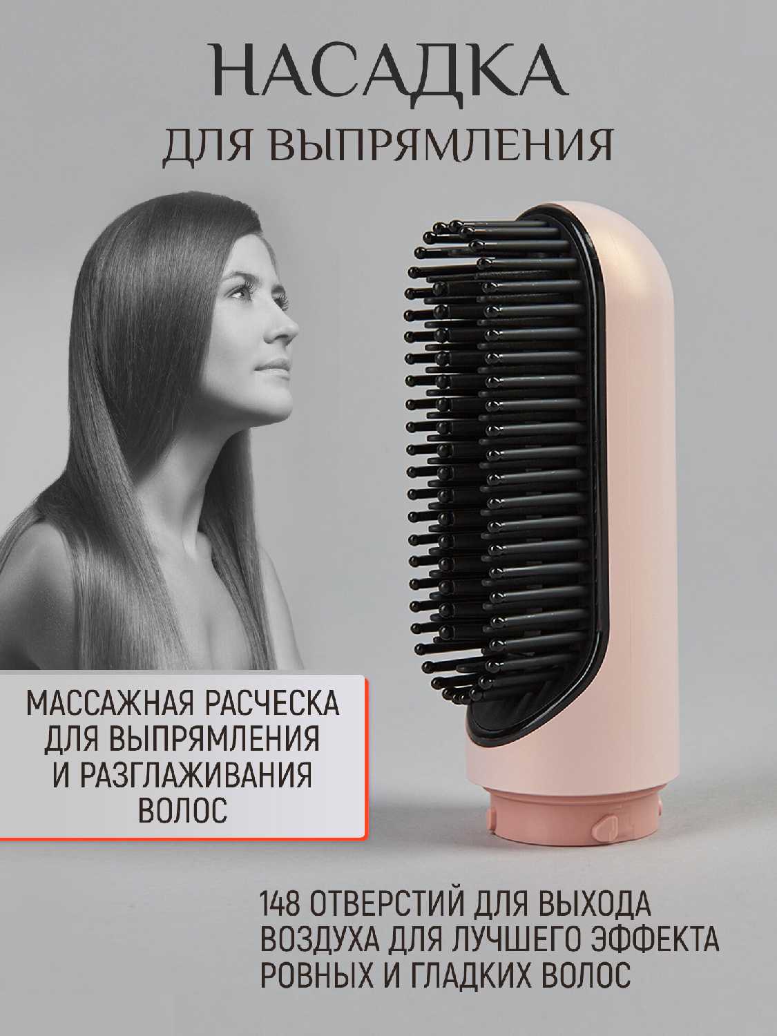 - Расческа-насадка с керамическим покрытием заменяет утюжок, выравнивая волосы за один проход.