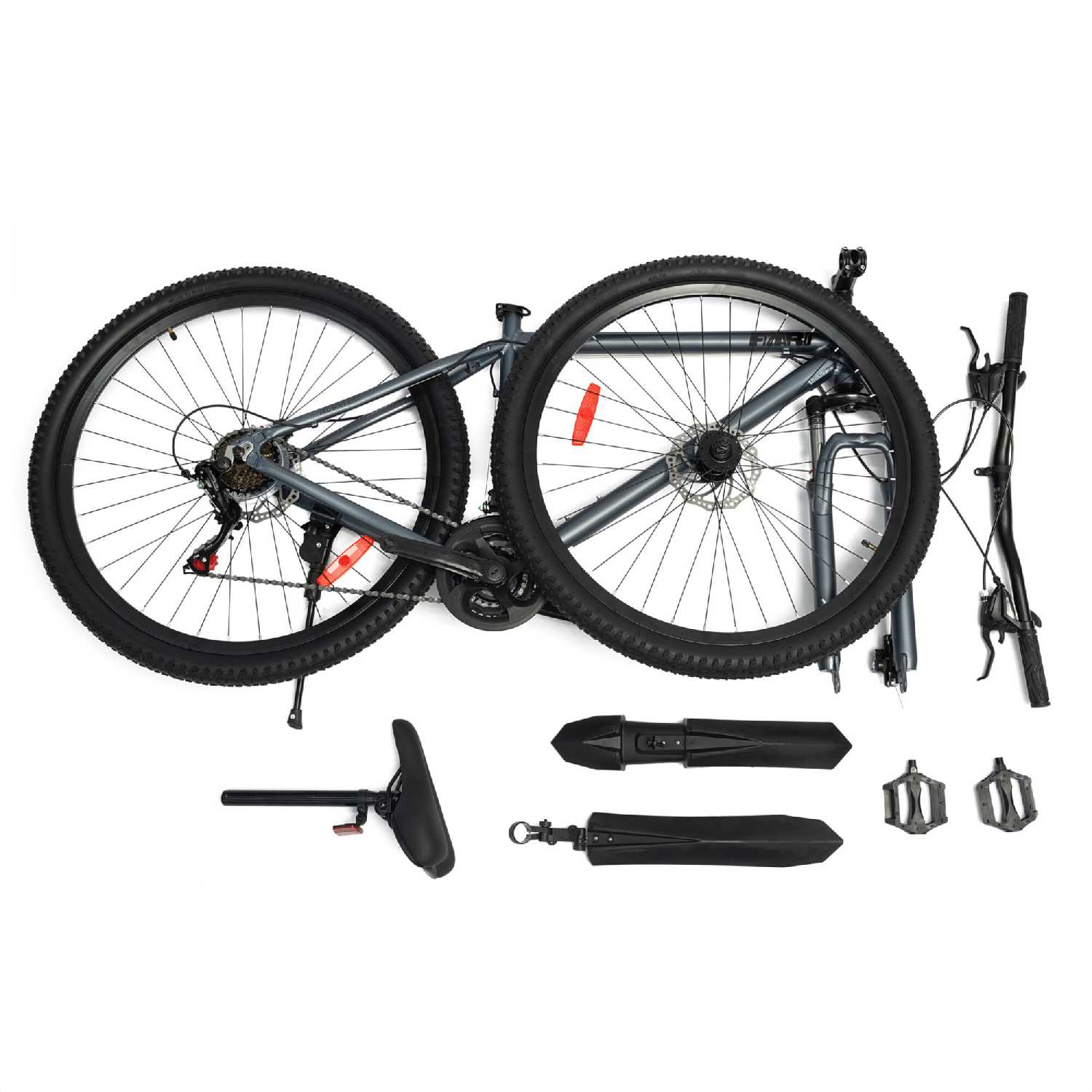 Сиденье жесткое и узкое натирает промежность после 10-20 км, болтается в горизонтали несмотря на затяжку, меняется на пружинное за 500 руб большинством владельцев. Геометрия рамы коротковата для 29" колес: при раме 19" (рост 175-185 см) носок обуви цепляет переднее колесо на поворотах >15°, решается постановкой стопы носком или привыканием за неделю. Руль шириной 71 см удобен для роста 180+ см, грипсы рвутся за 1-2 месяца падений, подножка гнется под 80+ кг и зажимает пальцы при уборке. Крылья пластиковые хлипкие, переднее бьет раму на кочках, снимаются для бездорожья.