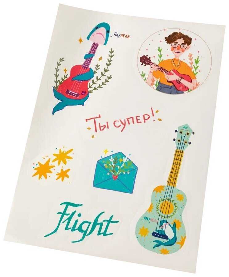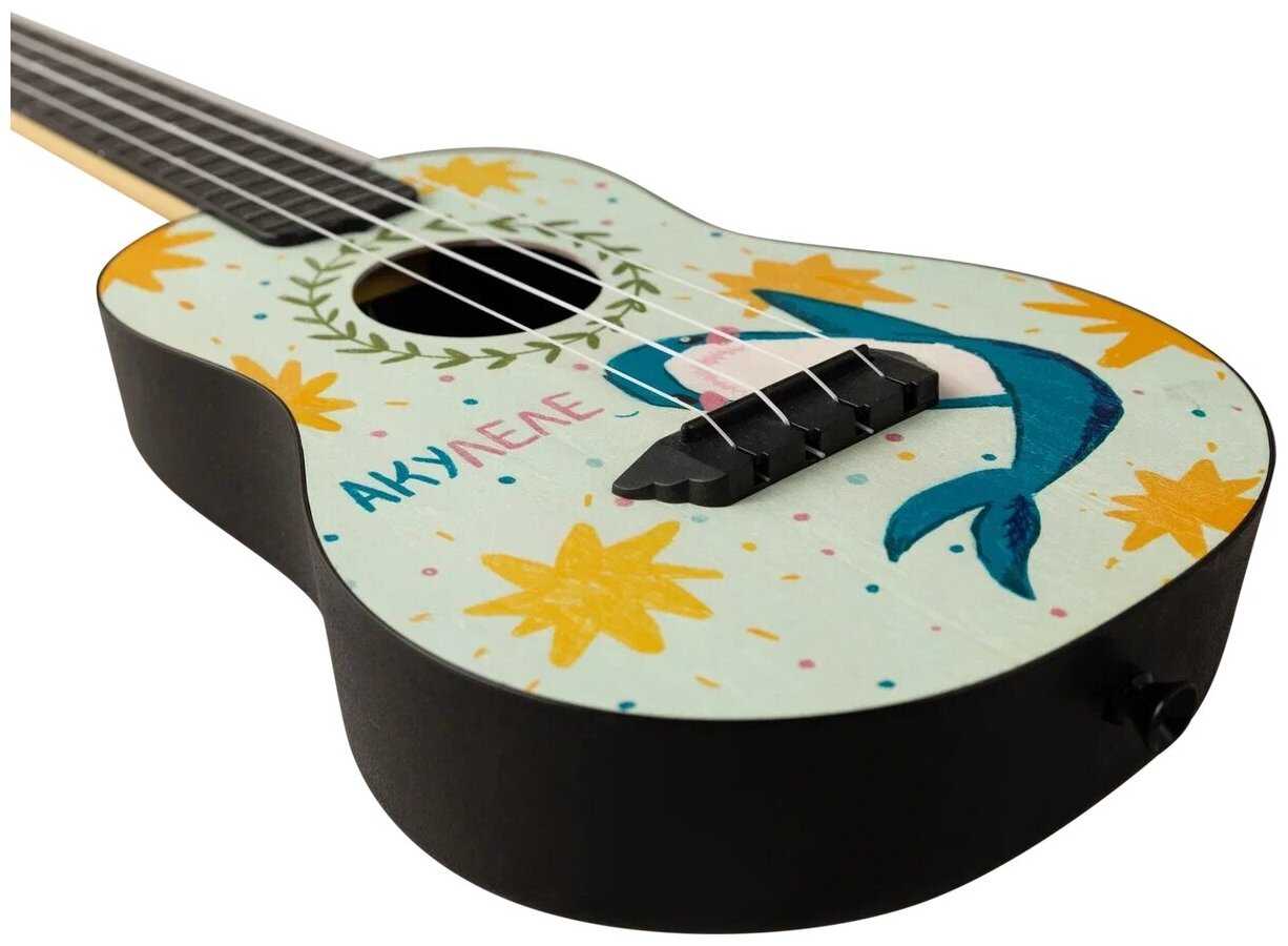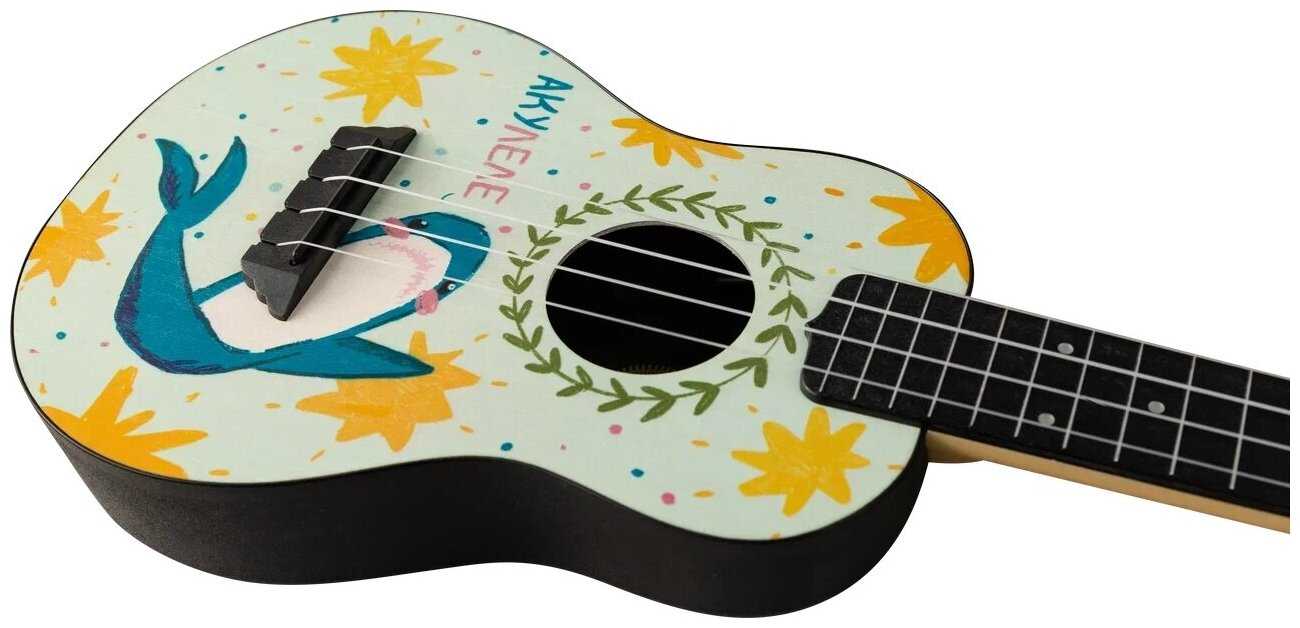В комплекте : | цветная коробка, укулеле, чехол, стикеры, мини-самоучитель |