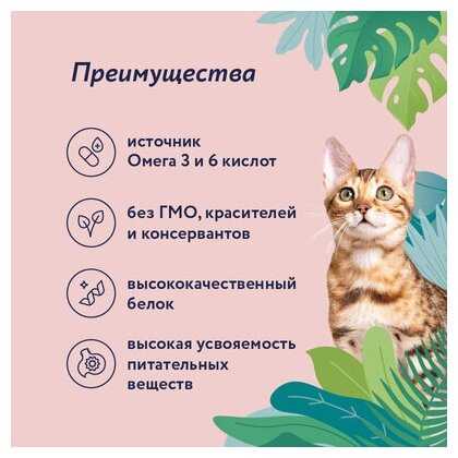 - Корм подходит для животных разных пород (сфинксы, мейн-куны, бенгальские) и возрастов (от котят до пожилых кошек), демонстрируя универсальность формулы.