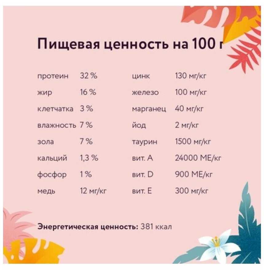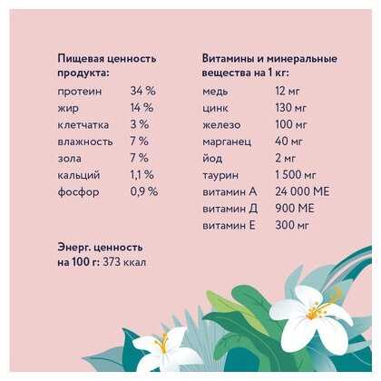 | Минеральные вещества : | кальций 1, 1%, фосфор 0, 9%, медь 12 мг/кг, цинк 130 мг/кг, железо 100 мг/кг, марганец 40 мг/кг, йод 2 мг/кг, таурин 1500 мг/кг |