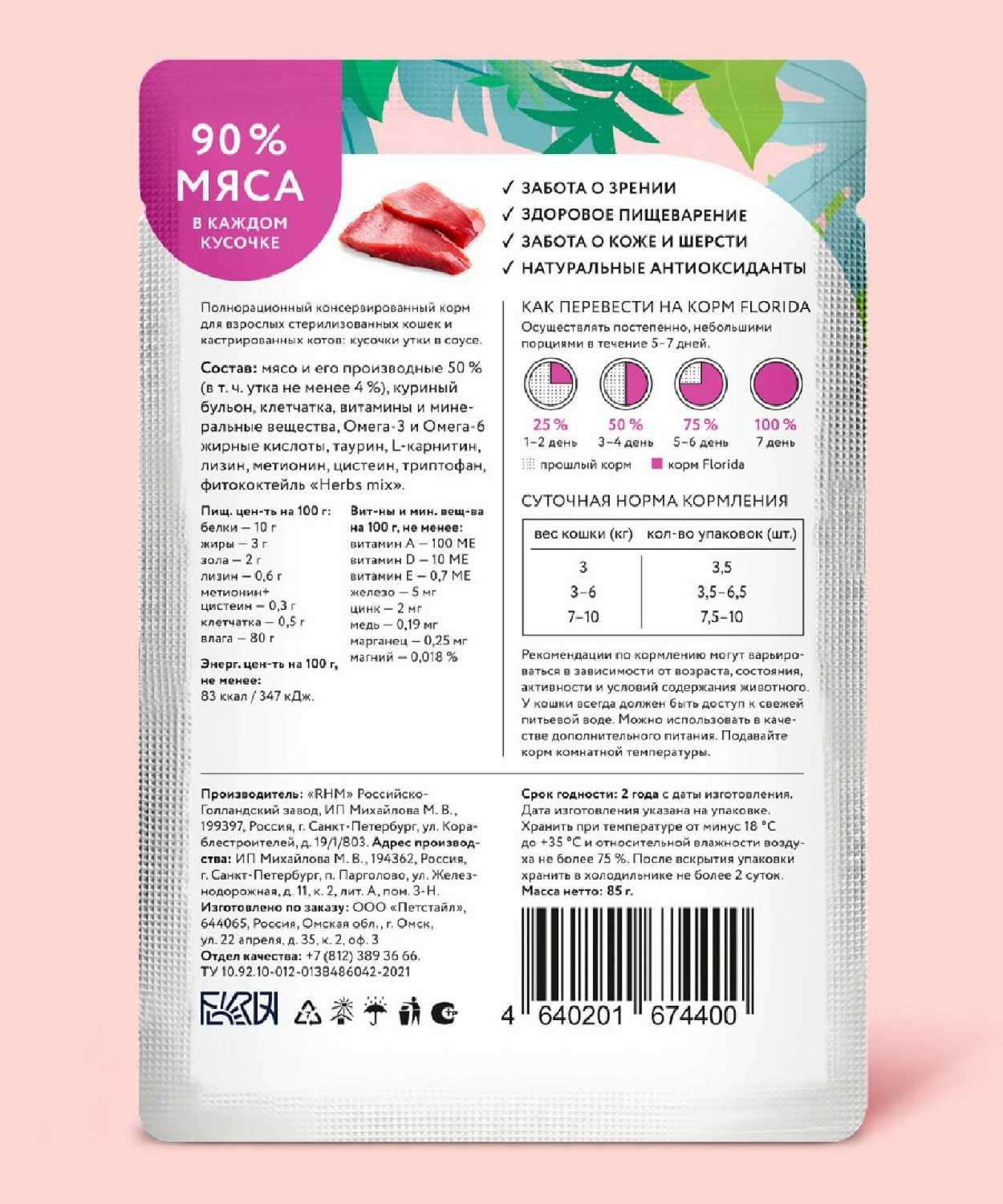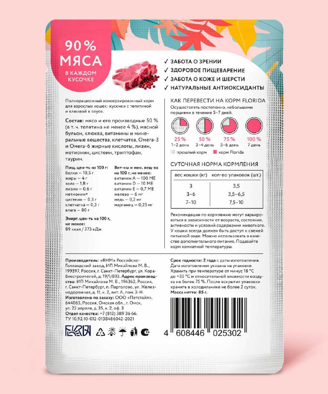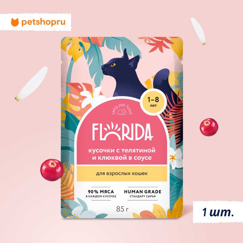 Отзывы о Корм для кошек FLORIDA Паучи для взрослых кошек (кусочки с телятиной и клюквой в соусе)