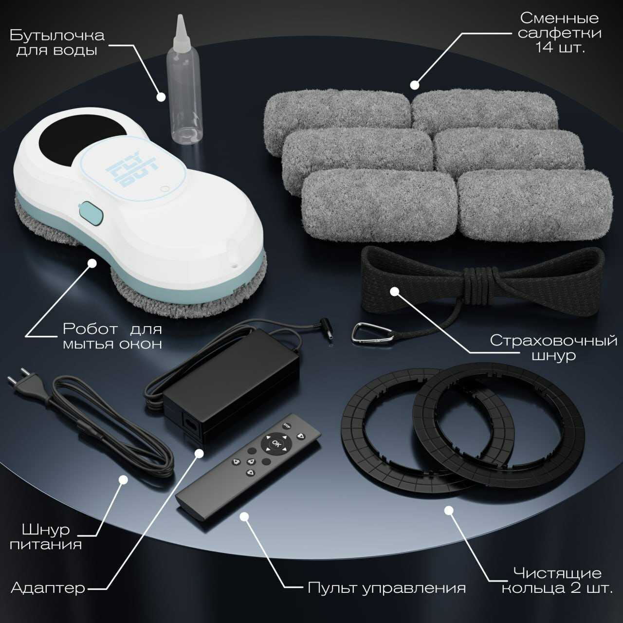 В комплекте : | адаптер питания, аккумулятор, моющая тряпка, пульверизатор, пульт ДУ, страховочный шнур, удлинитель сетевого шнура, фиксирующее кольцо |