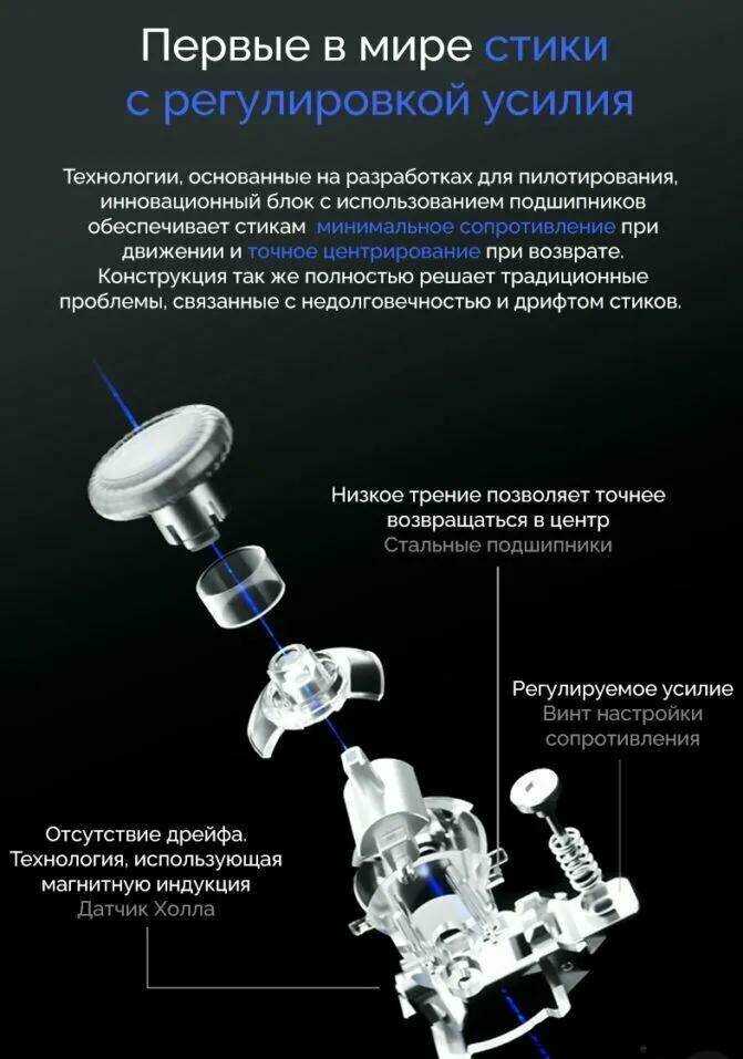 - Отсутствие механического контакта в электронике стиков, разумеется; то есть минус шум, непредвиденные мёртвые зоны и нелинейные участки из-за износа дорожек резисторов.