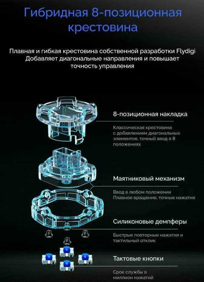Приятный материал и эргономика, хотя кнопки снизу дополнительные возможно не всем зайдут, как уже некоторые писали в отзывах, но мне не мешают. - - Отсутствие нормальной бумажной инструкции на русском в коробке. Есть общие вещи по подключению на китайском и английском. По гироскопу например вообще нет ничего в ней, пришлось лезть на оффициальный сайт Flydigi, чтобы узнать, что за приложение на ПК нужно установить для доп. настройки.