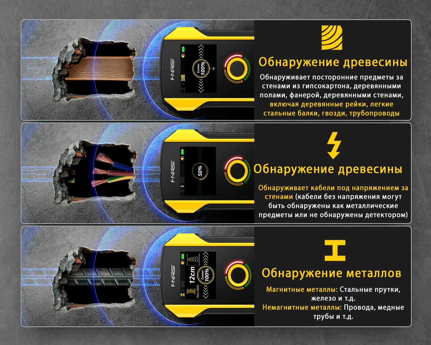 Дерево и чёрный металл видит хорошо, немагнитный металл и слаботочные провода наводит хуже. Ноль в режиме проводки не считывает. Реагирует на разные материалы, но требует чуткого теста по электрике. Подносил к руке — срабатывал в режиме дерева. Подходит для профиля и арматуры. -