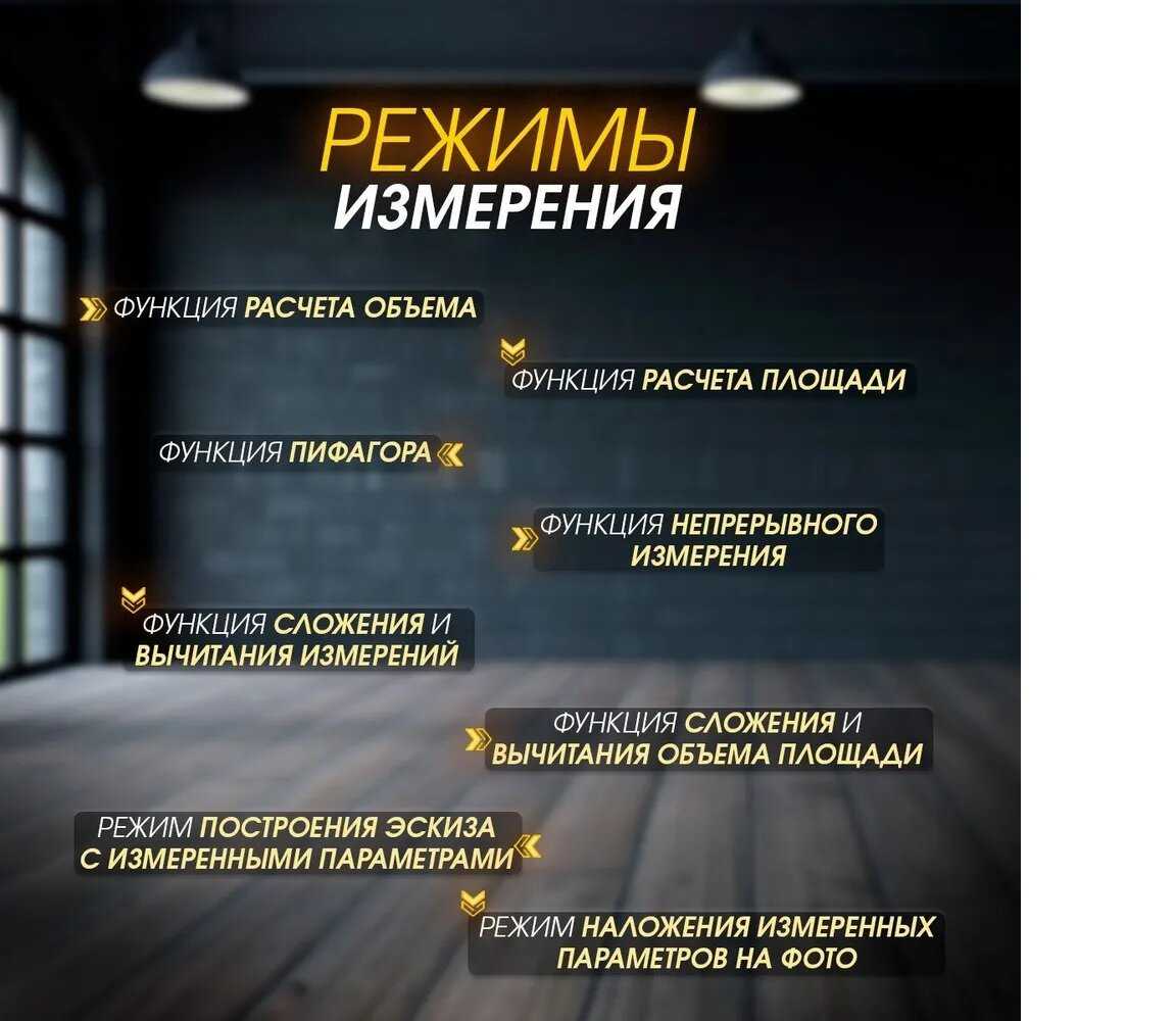 не ожидал от такого малыша такую многозадачность. показывает все необходимые измерения, измеряет площадь, объём, гипотенузу, дополнительные ещё функции. а самая главная фишка, что это всё коннектится с телефоном по блютуз и в режиме реального времени, он все измерения заносит сразу в телефон в приложении. и там уже в приложении это всё можно все замеры подписать, где какой замер чтобы потом не запутаться и точно знать, где что. и в добавок ко всему этому и ещё там же в приложении есть калькулятор, который сразу всё суммируешь или вычитаешь всё что нужно это просто класс. а Вишенка на торте это то что так же там в приложении ты можешь начертить лёгкий эскизик ну, типа план помещения со всеми выступами, и проставить все замеры сразу быстро.