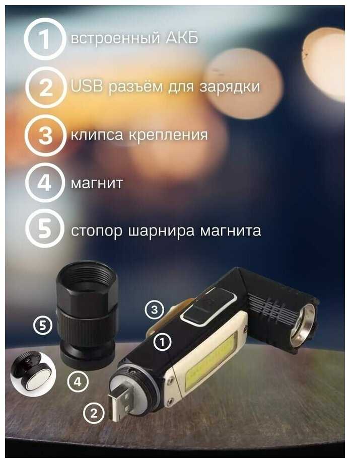 | Особенности : | USB-зарядка, влагозащита, дневной белый свет, красный свет, маячок, мигание, поворотная головка, регулировка угла свечения, ударопрочный корпус |