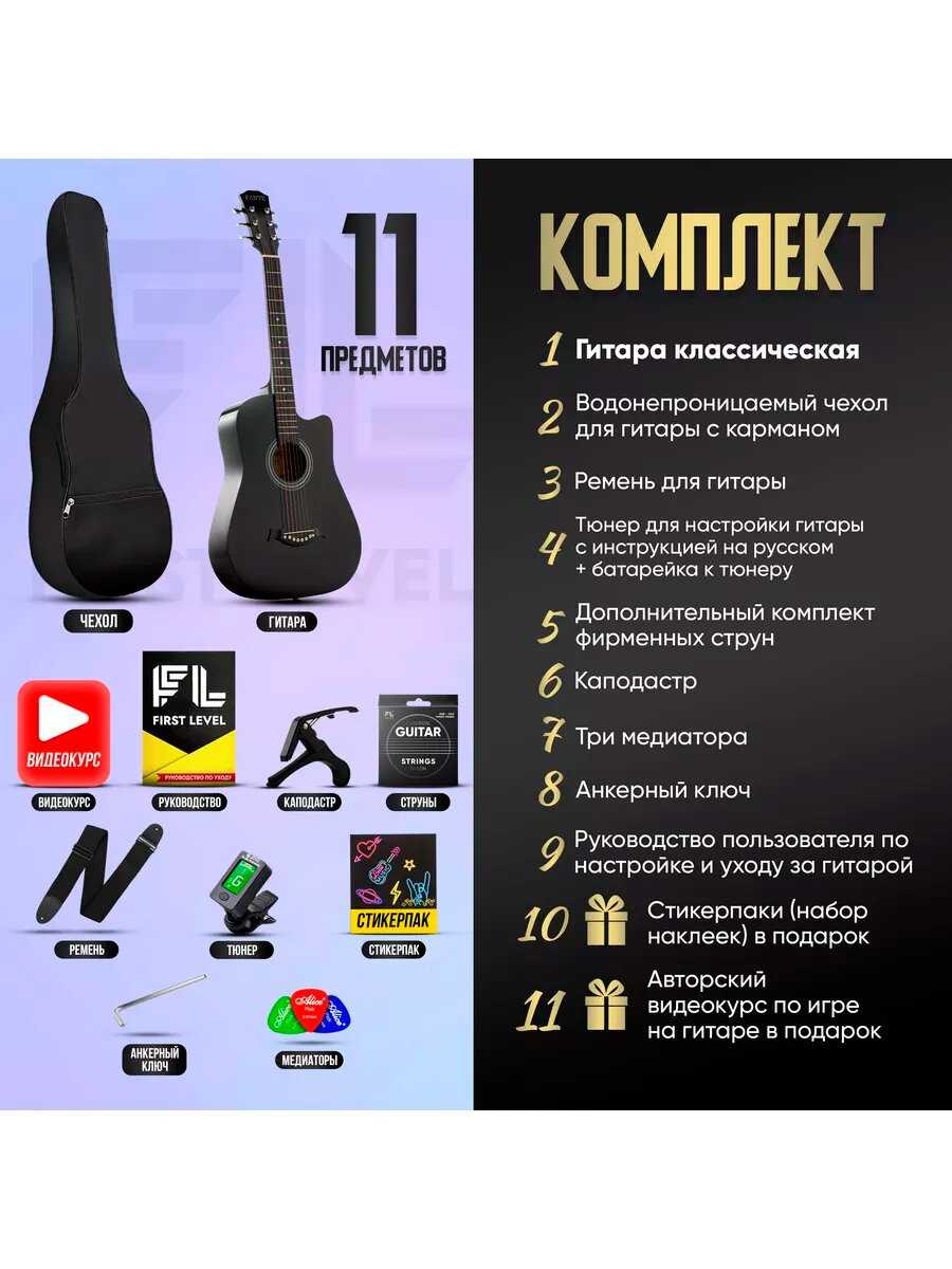 Комплектация — безусловный плюс, признаваемый даже критиками. В набор входят: чехол (несмотря на его качество), цифровой тюнер, ремень, медиаторы (до 6 штук), каподастр, запасные струны, стикеры и памятка. Эта полнота особенно ценится начинающими, избавляя от необходимости докупать аксессуары отдельно. Однако "бесплатный курс обучения", упомянутый в описании, оказался маркетинговым ходом — доступен лишь первый урок, далее требуется оплата.