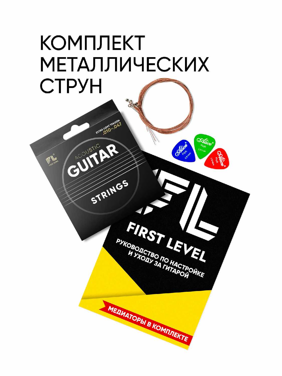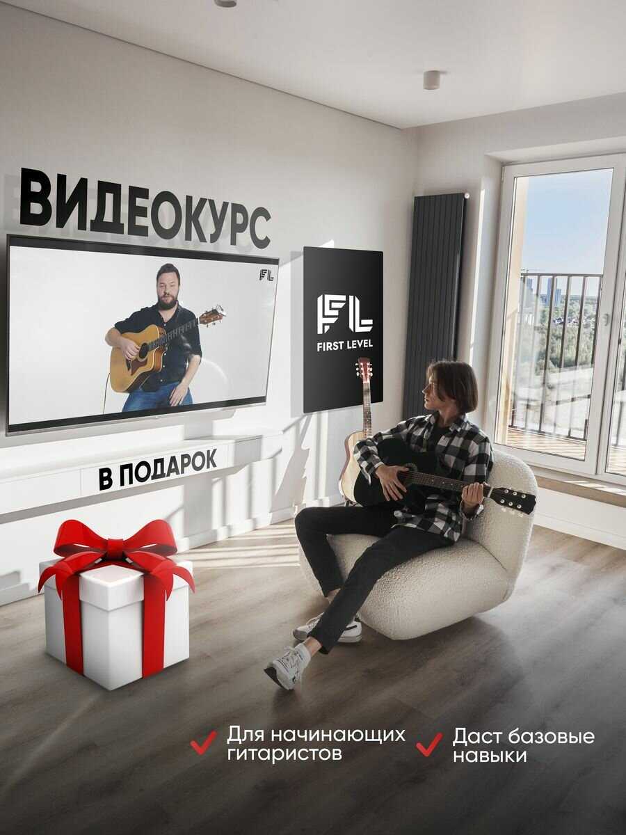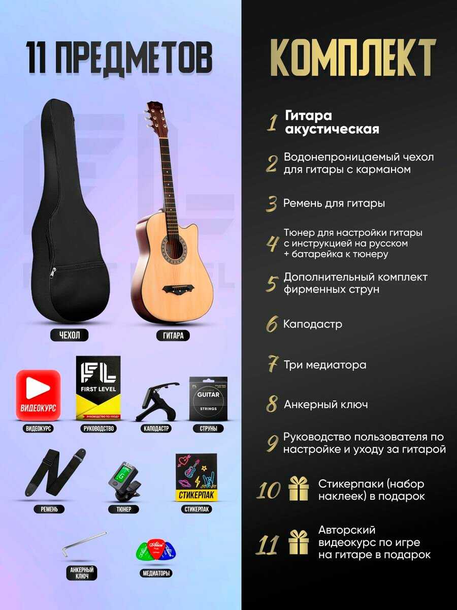 В комплекте : | 1. Гитара акустическая размер 38" (7/8), 2. Водонепроницаемый чехол для гитары c карманом, 3. Дополнительный комплект фирменных струн, 4. Ремень для гитары, 5. Тюнер для настройки гитары с инструкцией на русском языке + батарейка к тюнеру, 6. Каподастр, 7. Три медиатора, 8. Анкерный ключ, 9. Руководство пользователя по настройке и уходу за гитарой + Авторский видео курс по игре на гитаре в подарок! 10. Стикерпаки (набор наклеек) в подарок! |