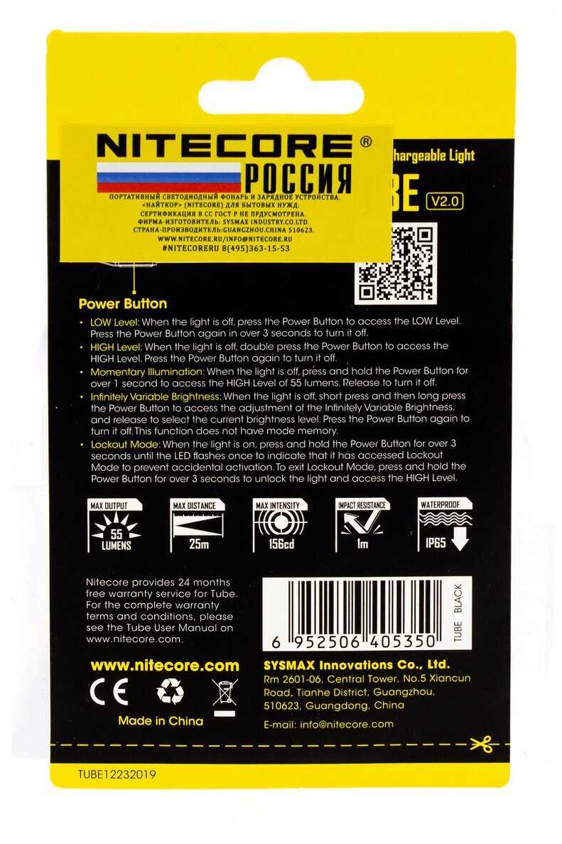 Nitecore TUBE V2.0 BLACK З/У USB наключный фонарь