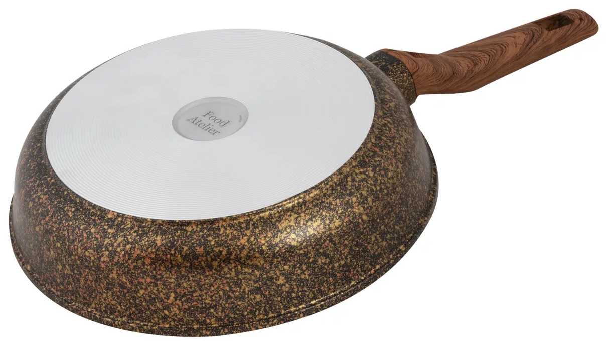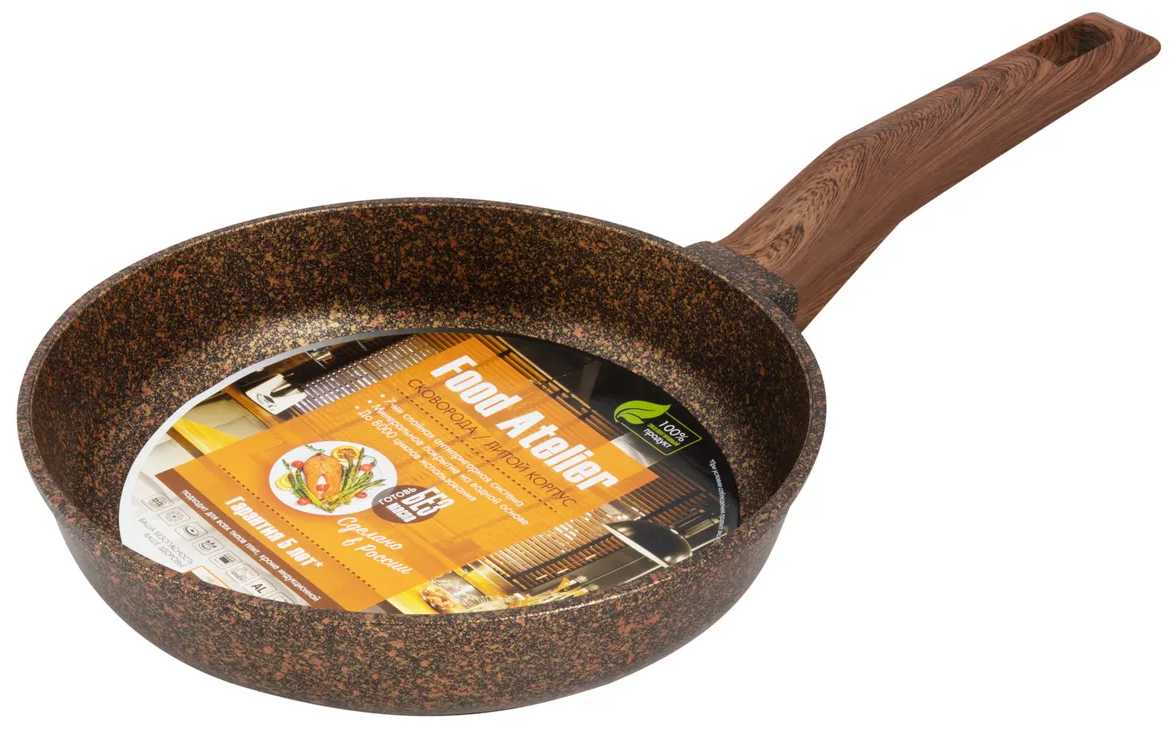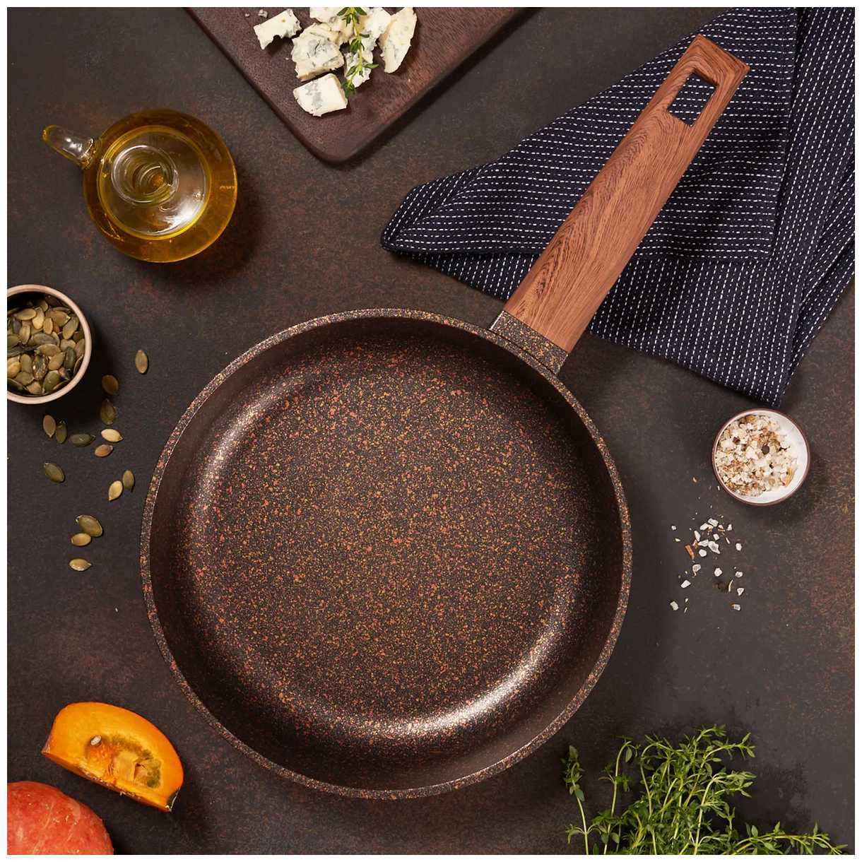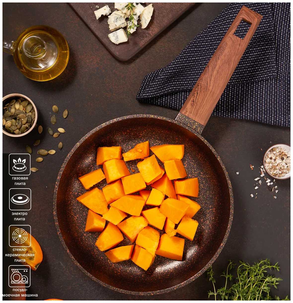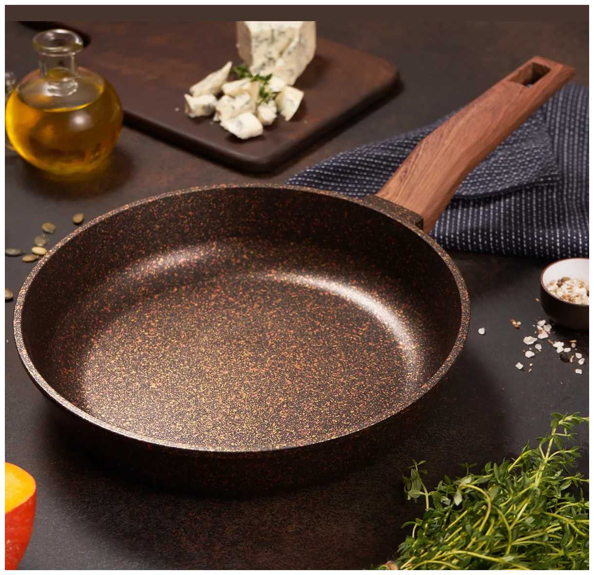 - + Шикарная сковорода. Тяжёлая. Думала что ручка деревянная, но она пластиковая и удобная. Был клей от этикетки внутри сковороды,...