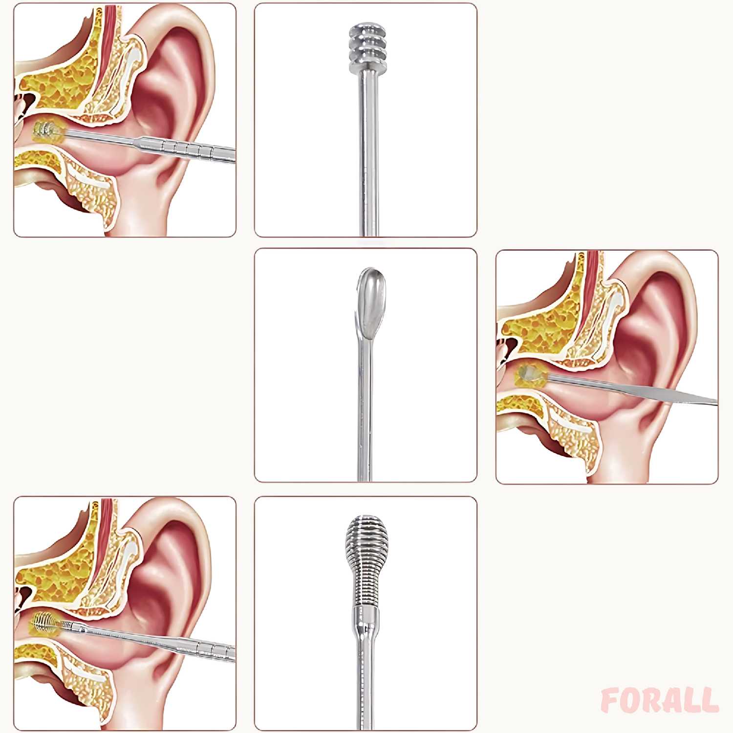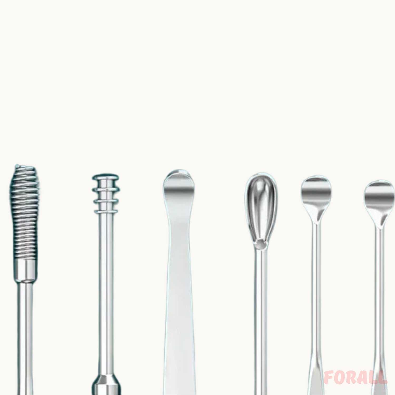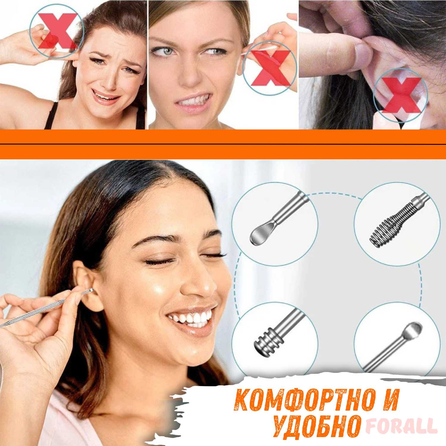 - Включает 6 профильных насадок (ложечки, спирали, крючки), адаптированных под разные типы ушной серы.