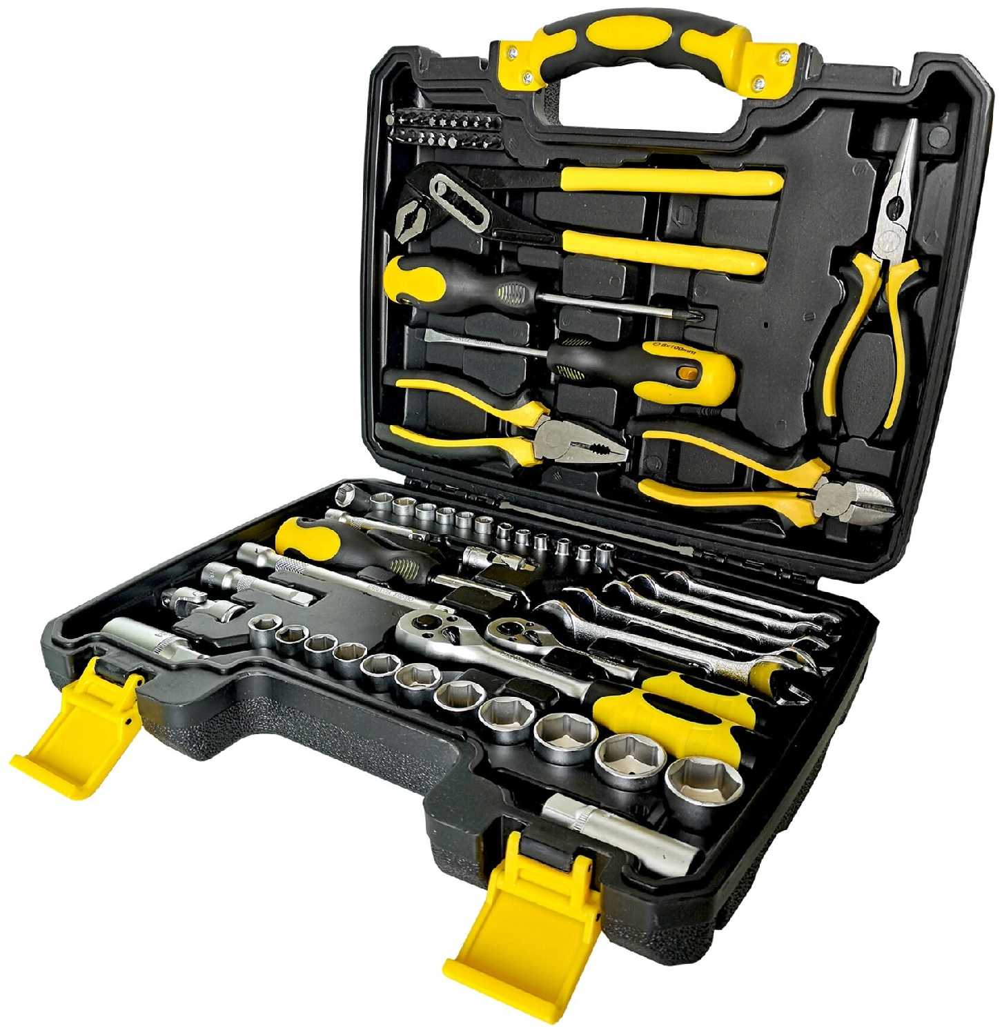 | Инструменты в комплекте : | вороток для головок, длинногубцы, клещи, ключи гаечные, ключи имбусовые (шестигранные), ключи торцевые, кусачки, отвёртки, пассатижи, плоскогубцы, рукоять для бит, трещотка |
