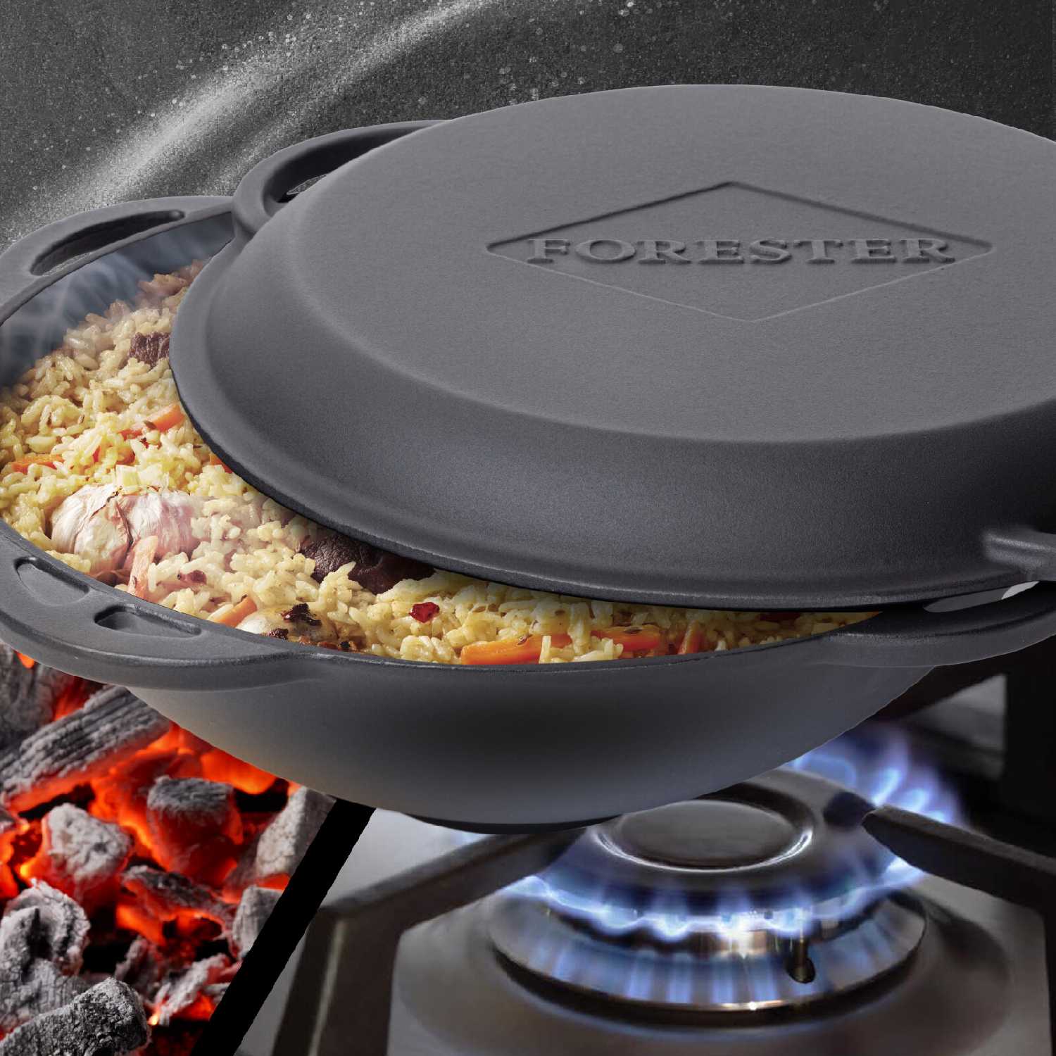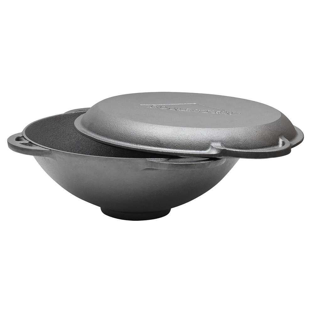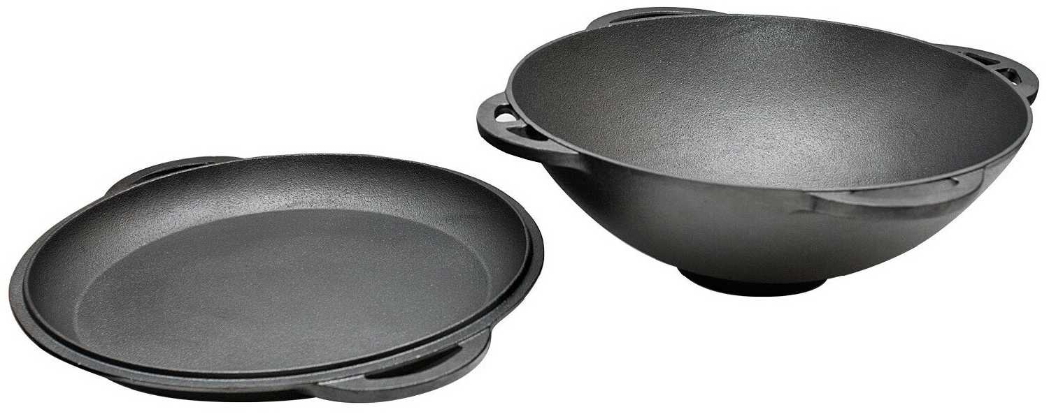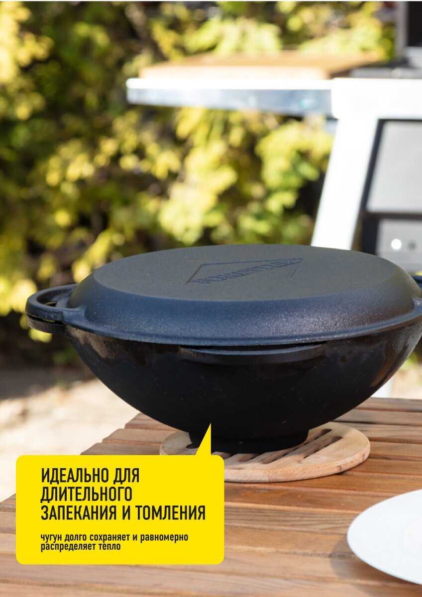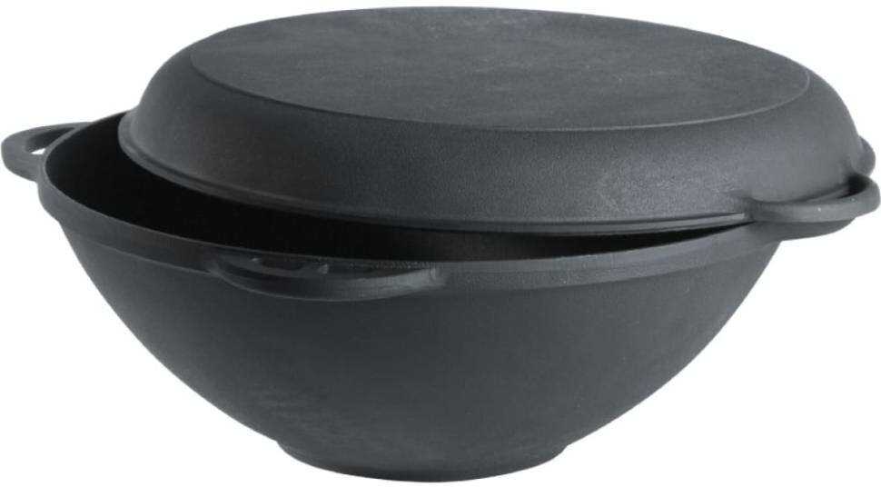 Вместительный чугунный казан. 9-ти литровый объем- то, что нужно. Равномерно распределяет тепло и долго сохраняет, так что если что-то не дотушили слегка, легко дойдет под закрытой крышкой. О крышке должна написать отдельно. Крышка - это самостоятельная единица, самая настоящая сковорода, на которой можно жарить на плите и что-то запекать в духовке. Используем казан на костре и на плите, крышкой-сковородой так же пользуемся на мангале. Легко моется, ничего не прилипает.