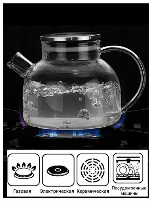 Чайник подходит для нагрева на электрической и газовой плите, что подтверждается отзывами. Некоторые пользователи также успешно используют его с подставкой-свечой для поддержания температуры напитка. Стекло выдерживает термические нагрузки, но важно избегать резких перепадов температуры, например, не лить кипяток в холодный чайник. -