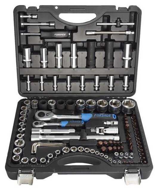 | Ручной инструмент подробно : | трещотка 1/4": 48 зубов, удлинитель 1/4": 50 100 мм, гибкий удлинитель 1/4": 150, удлинитель 1/2": 125 250 мм, трещотка 1/2" |