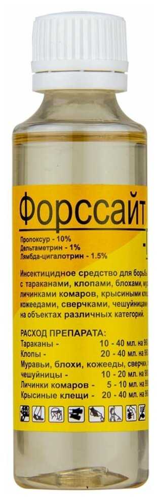 | Подробная комплектация : | Форсайт (Форссайт) ПРО средство от клопов, тараканов, блох, муравьев, кожеедов, чешуйниц 50 мл - 1 флакон |
