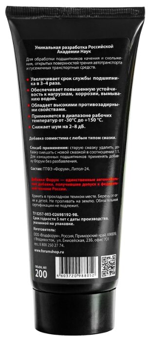Дополнительная информация : | размешанный в ЛИТОЛ-24 полимер УПТФЭ-Форум обволакивает тонкой плёнкой пары механического трения и защищает от износа |