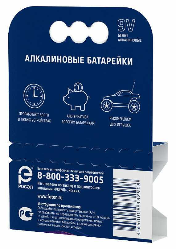 | Типоразмер : | Крона (6LR61, 6LF22, 6KR61, 1604A) |