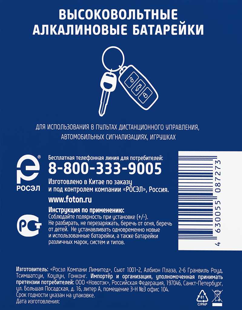 Дополнительная информация : | Батарейка фотон 27A блистер |