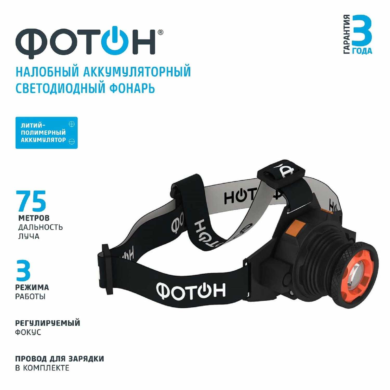 | Дополнительная информация : | регулируемый фокус, тип аккумулятора: Li-pol, подробная комплектация: Фонарь налобный аккумуляторный ФОТОН SА-900, количество режимов работы: 3, потребление питания: от USB |