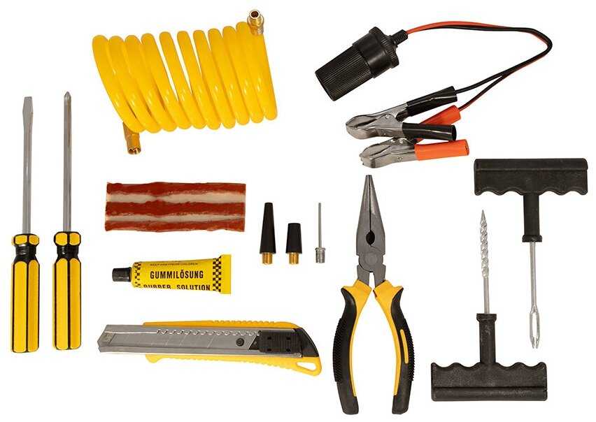 Подробная комплектация : | Автомобильный компрессор Адаптер для подключения к АКБ - 1шт. Спиральный воздушный шланг - 1шт. Плоскогубцы - 1шт. Шило - 1шт. Клей - 1шт. Штопор (для клея) - 1шт. Жгуты ремонтные - 3 шт. Универсальные насадки - 3 шт. Отвертка "-" - 1шт. Отвертка "+"- 1шт. Инструкция по эксплуатации и гарантийный талон |