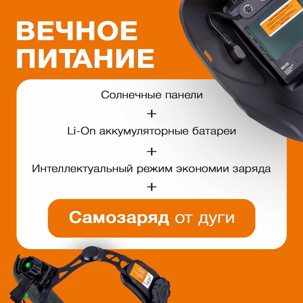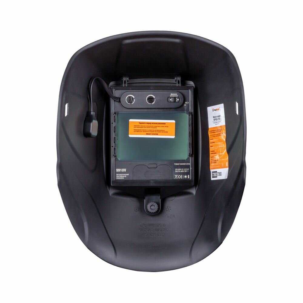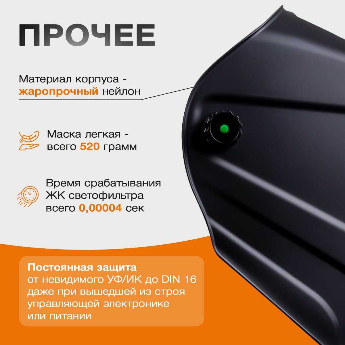 | Особенности : | защита от УФ/ИК лучей, защита от брызг расплавленного металла, изменяемая скорость срабатывания светофильтра, подходит для газосварки, установка защитного стекла |