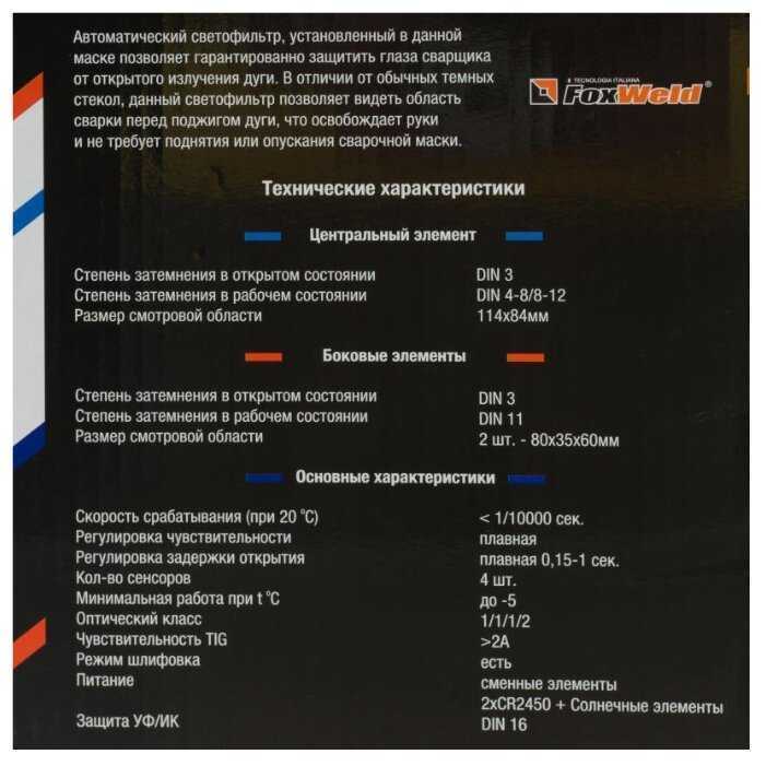 | Дополнительная информация : | обзором 180 градусов, два режима затемнения: 4-8 / 8-12 DIN, у боковых окн в открытом состоянии степень затемнения - 3DIN в рабочем состоянии - 11 DIN, размеры смотровой области каждой стороны - 80х35х60 мм, устанавливаемый светофильтр - MEGA |