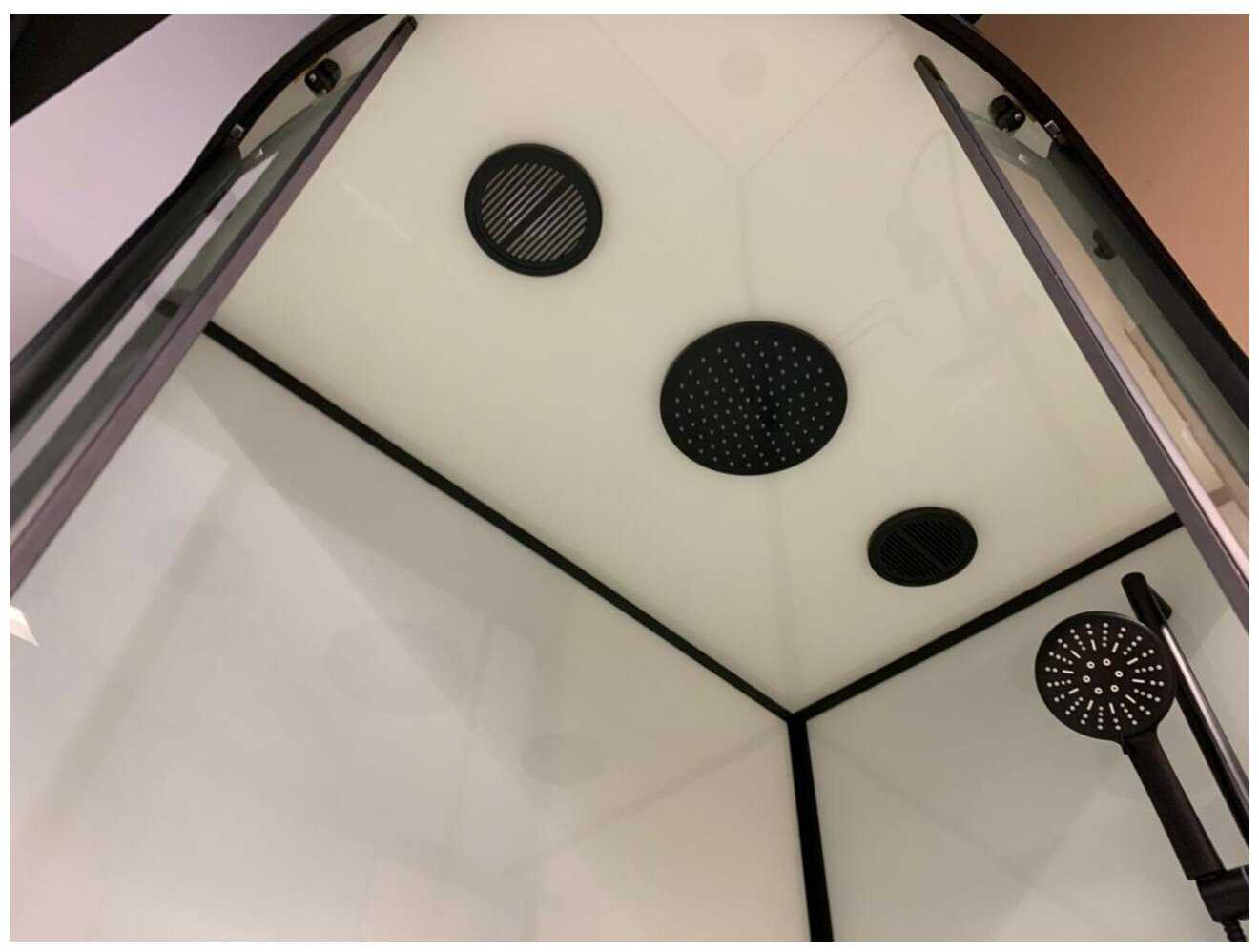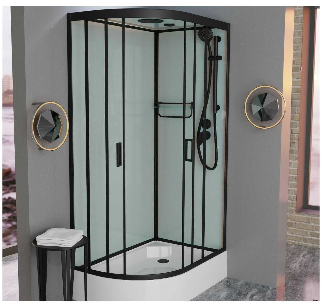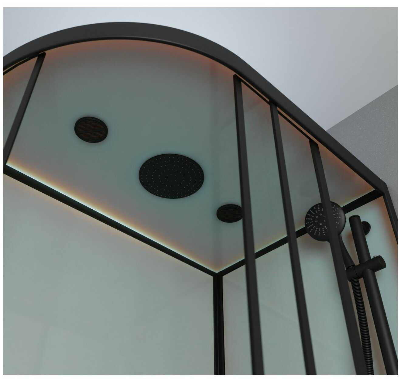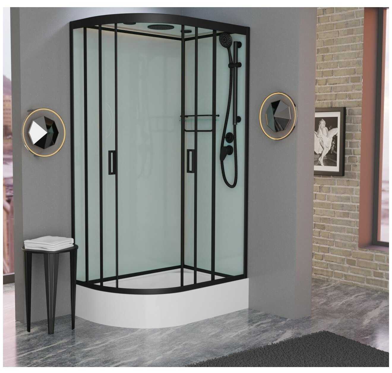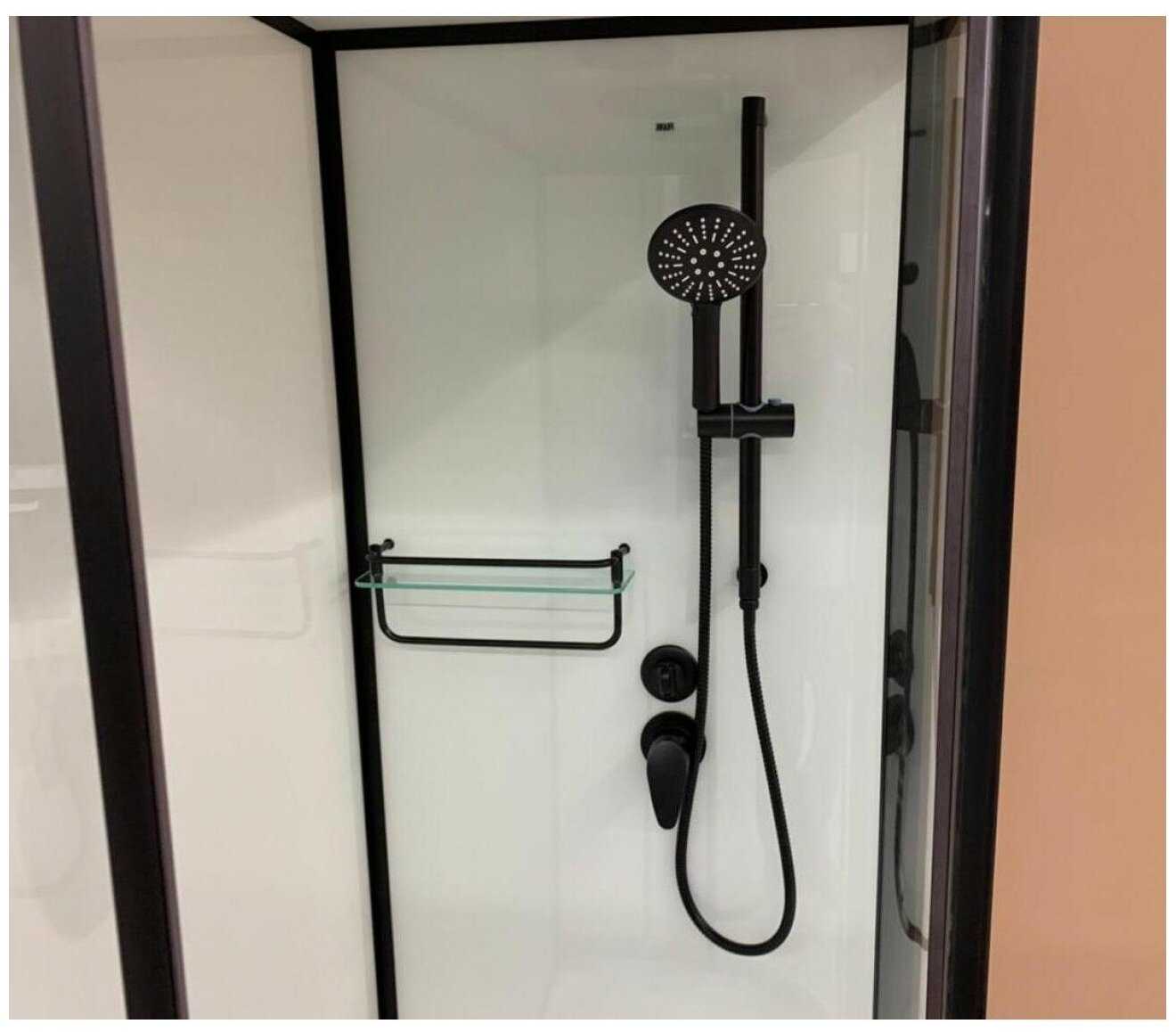 материал профилей: сплав дюралюминий (чёрный цвет), высота поддона: 25 см, колба сифона: ширина 70 мм (сливной донный клапан с кнопкой «клик-клак» (click-clack), закалённые стёкла, безсиликоновая сборка, резьбовые соединения смесителя с душем, верхний душ