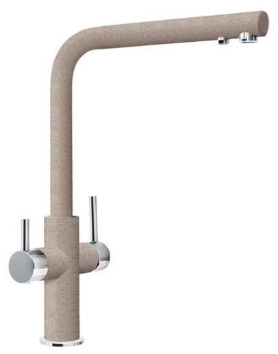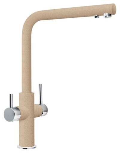 Классное решение с возможностью переключения с водопроводной воды на фильтр. Очень удобно – переключается одним поворотом рычага. Еще тут практичная форма излива – он высокий и далеко от края выступает, поэтому вода льется прямо на посуду сверху вниз, не надо...