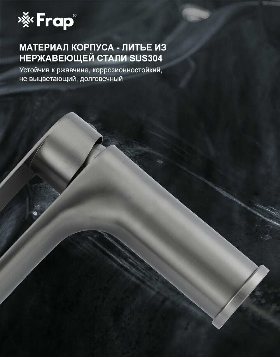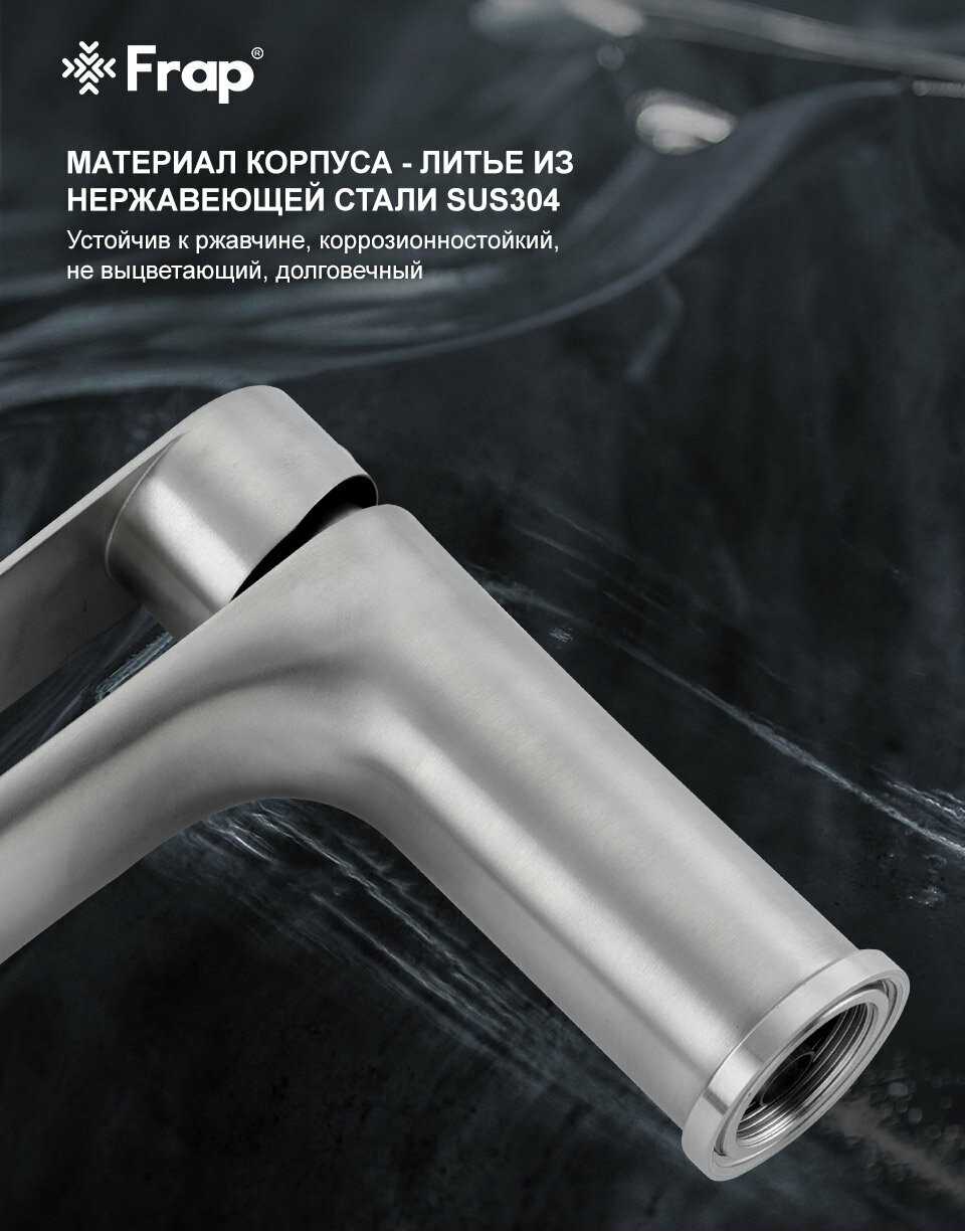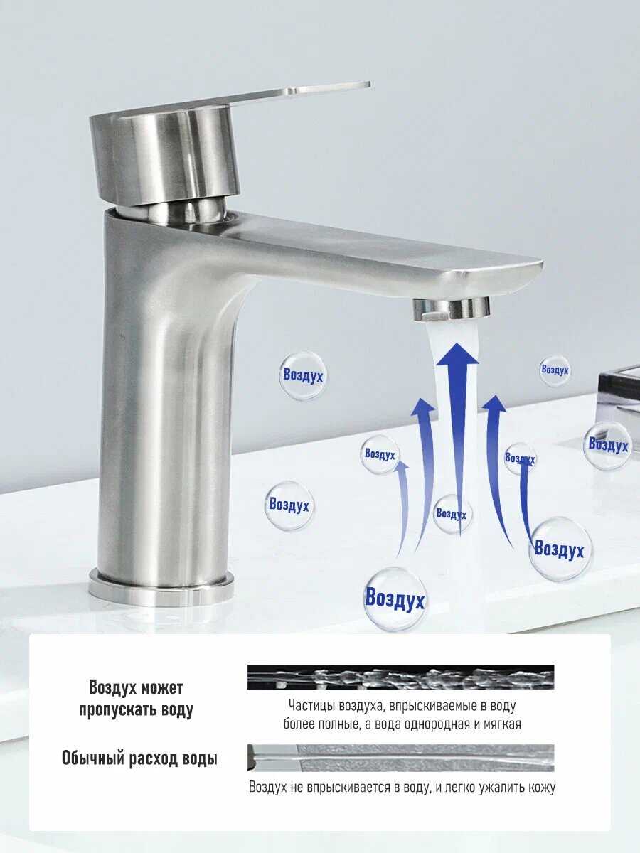 Смеситель выполнен из нержавеющей стали марки SUS304 (аналог 08Х18Н10), что подтверждается его значительным весом, который пользователи ассоциируют с использованием толстого металла. В большинстве отзывов отмечается отличное качество сборки и приятная на ощупь матовая поверхность. Однако некоторые пользователи столкнулись с мелкими дефектами шлифовки на видимых частях и в единичных случаях — со следами коррозии на новом изделии. -
