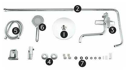 | Комплектация : | верхний душ, держатель лейки, душевая стойка, душевая штанга, излив для набора воды, лейка, набор эксцентриков, отражатель, переключатель потоков, ручной душ, смеситель, шланг |