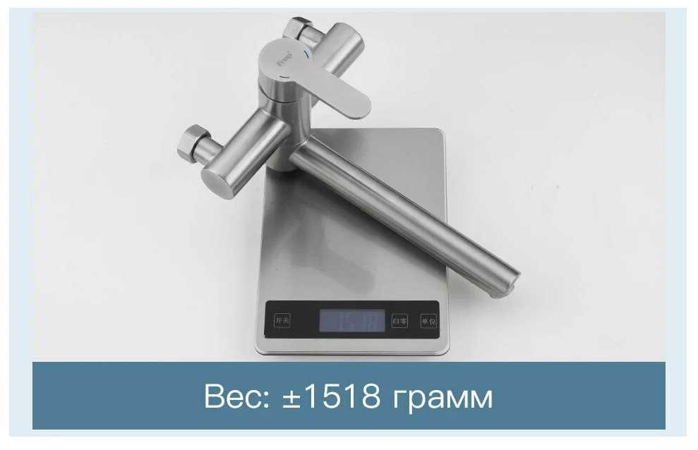 Смеситель изготовлен из нержавеющей стали, что отмечается в отзывах как признак высокого качества. Многие пользователи отдельно выделяют значительный вес изделия, который ассоциируется с надежностью и ощущением цельнометаллической конструкции. Качество сборки и материалов оценивается как отличное, внешний вид соответствует фотографиям, а матовое покрытие практично и не оставляет разводов. -