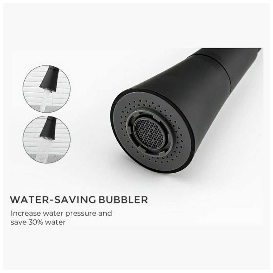 - Аэратор интегрирован в насадку, снижая разбрызгивание и экономя до 20% воды.