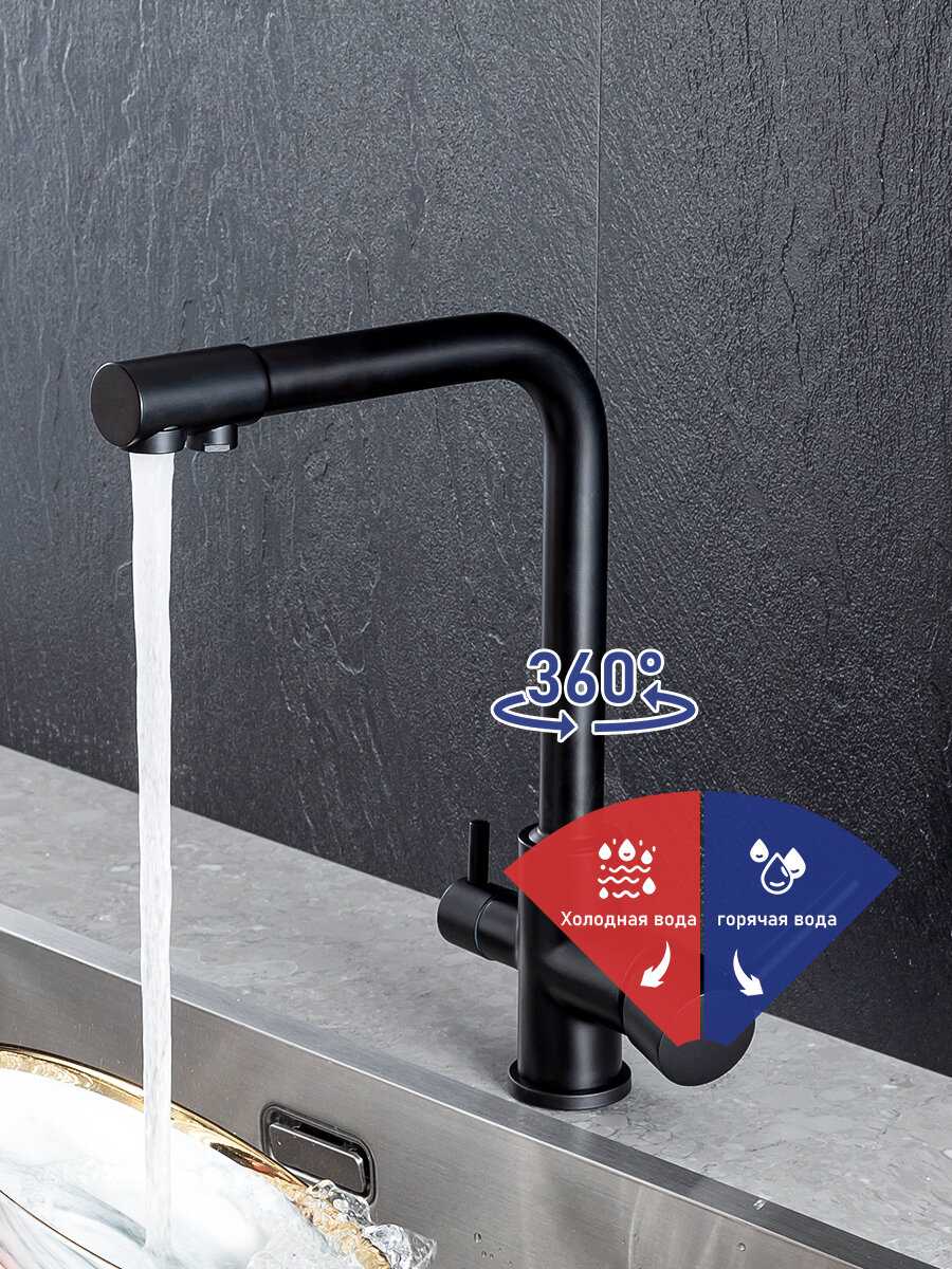 - + Тяжёлый. Качественный. Очень плавно открываются ручки крана. В комплекте есть 3 гибких шланга для подключения обычной воды и питьевого фильтра.